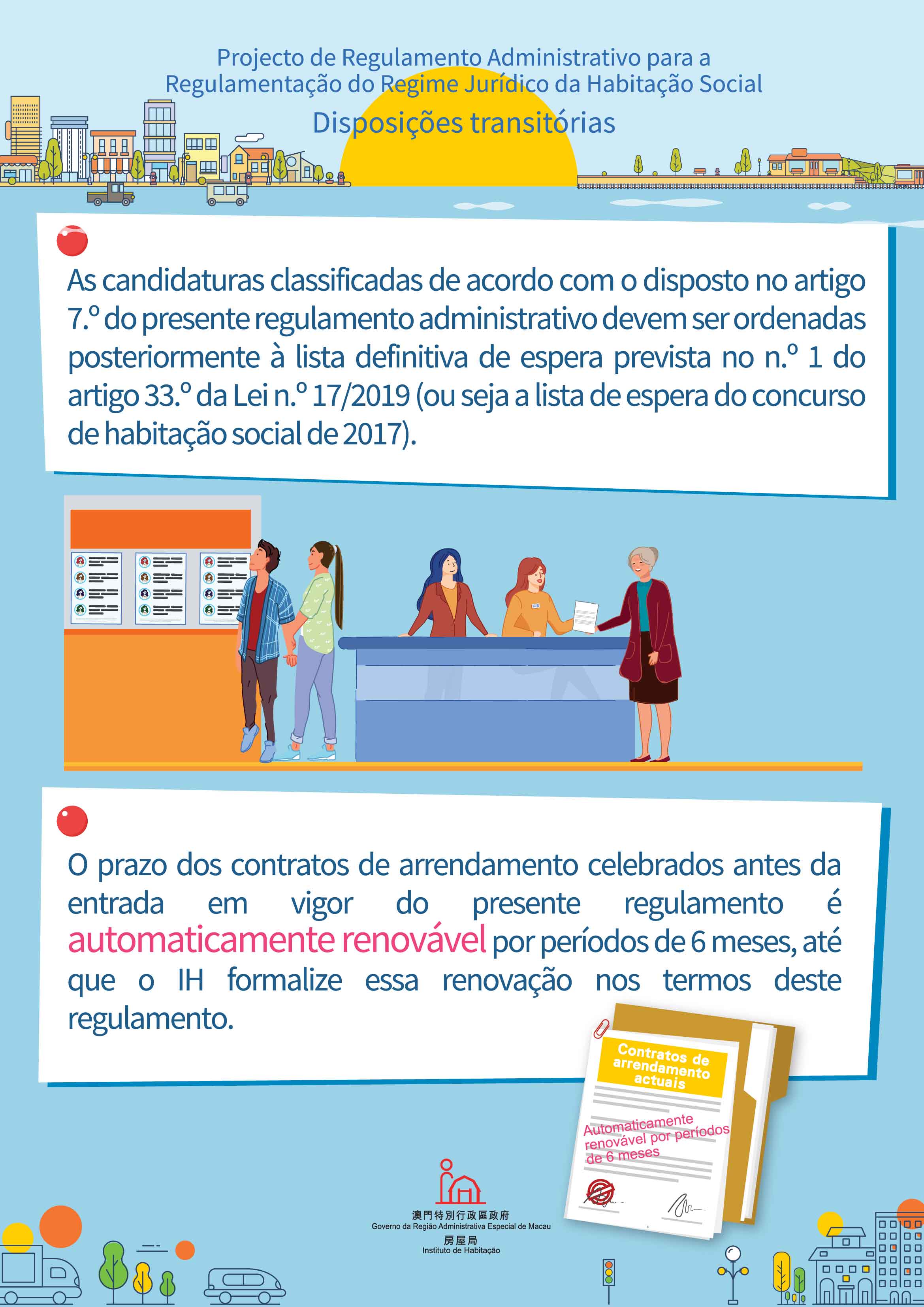 Disposições transitórias. Os candidatos, que apresentaram as suas candidaturas ao arrendamento de habitação social antes da entrada em vigor da Lei n.º 17/2019, classificados na lista definitiva de espera, terão prioridade sobre as candidaturas classificadas em conformidade com a pontuação prevista neste regulamento administrativo. Além disso, o prazo dos contratos de arrendamento celebrados antes da entrada em vigor do presente regulamento administrativo é automaticamente renovável por períodos de 6 meses, até que o IH formalize essa renovação de acordo com os termos previstos para a apreciação da renovação do contrato de arrendamento.