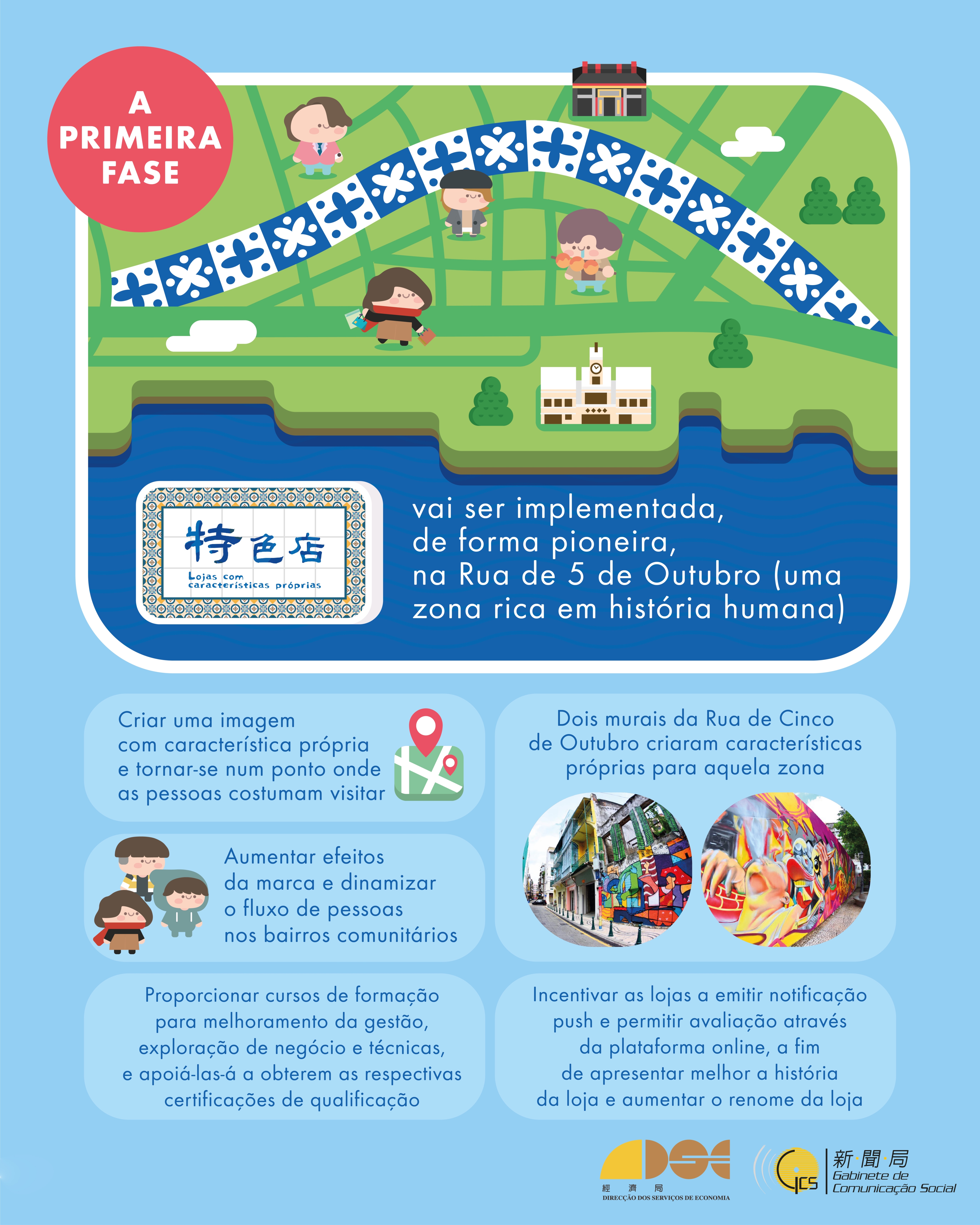 A primeira fase do “Plano das Lojas com Características Próprias” lançou-se, de forma pioneira na Rua de 5 de Outubro. Esta zona é atractiva tanto para os locais como para os visitantes por ser uma zona rica em história da humanidade e com uma grande concentração de lojas e restaurantes característicos.