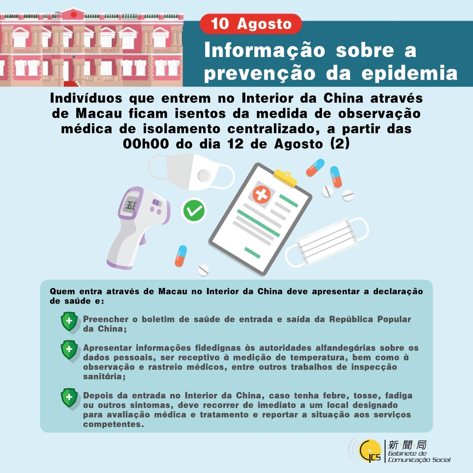 【Infografia】Indivíduos que entrem no Interior da China através de Macau ficam isentos da medida de observação médica de isolamento centralizado, a partir das 00h00 do dia 12 de Agosto.
