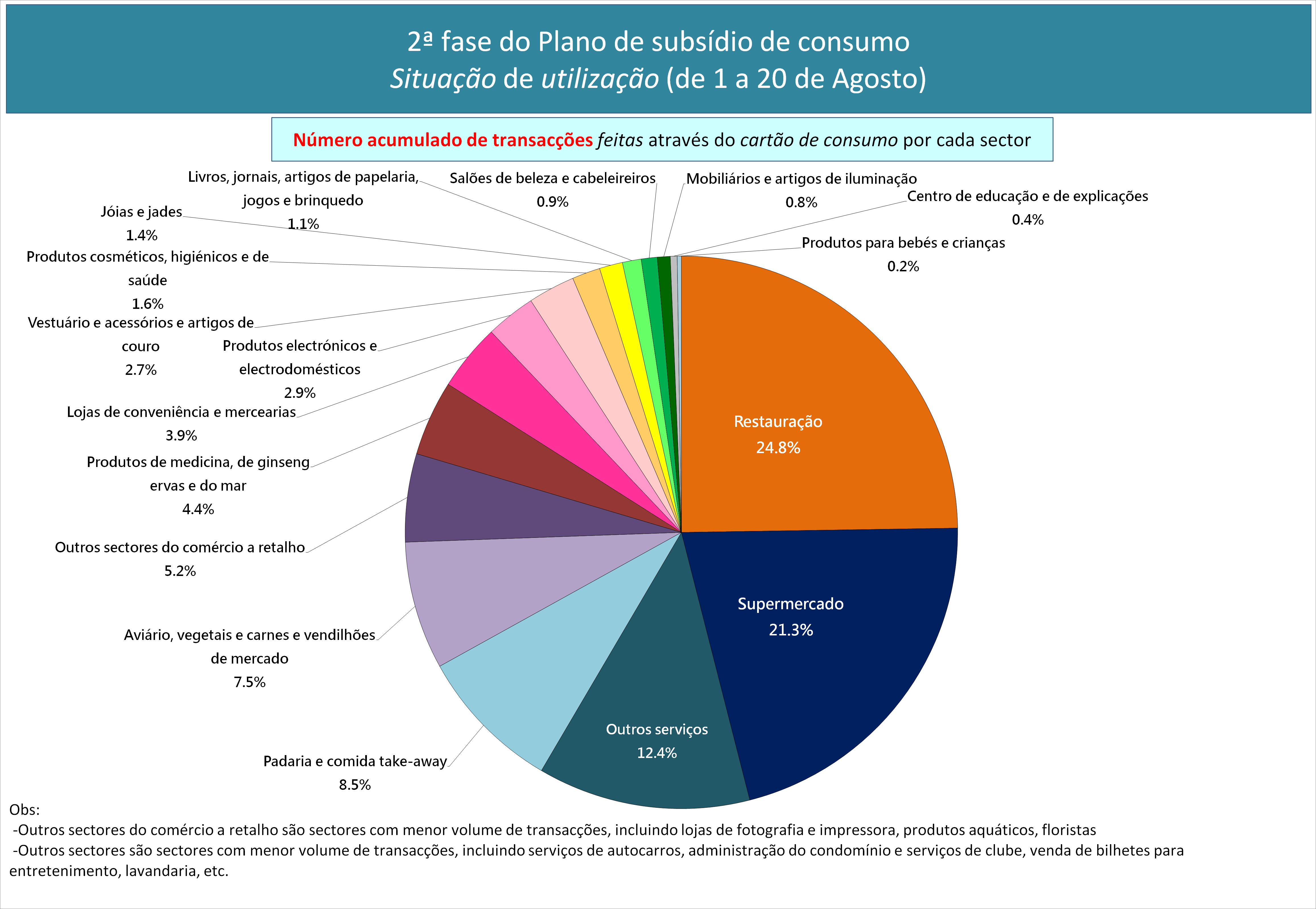 O sector de restauração ocupa cerca de 22,9%, dos quais, o número de transacções e o montante de consumo nos “estabelecimentos de comidas e lojas de sopas de fitas e canjas” ocupa o primeiro lugar, representando 46,6% e 32,2% do sector de restauração, respectivamente.