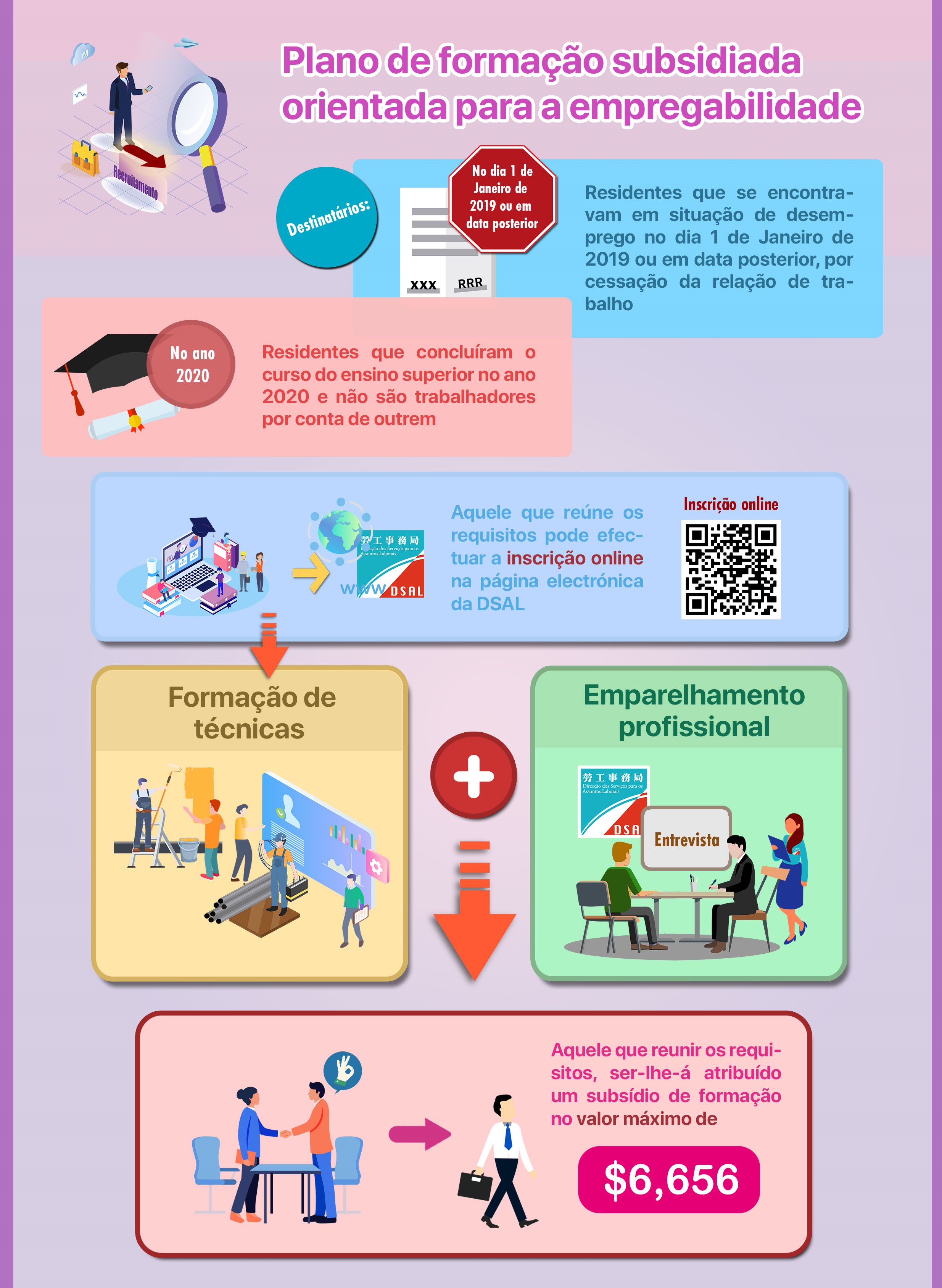 Por outro lado, para ajudar a integração no mercado de trabalho dos residentes com necessidade de encontrar emprego, também é criado o “Plano de formação subsidiada orientada para a empregabilidade” que é composto por duas partes: “Formação de técnicas” e “Encaminhamento profissional”. Os cursos são proporcionados pela DSAL e os formandos que concluírem o curso e colaborarem com o encaminhamento profissional, podem receber até 6 656 patacas. Os destinatários desse Plano são os residentes de Macau que se encontravam em situação de desemprego no dia 1 de Janeiro de 2019 ou em data posterior, por cessação da relação de trabalho, ou os que tenham concluído o curso de ensino superior no ano de 2020 e não sejam trabalhadores por conta de outrem. As inscrições desse “Plano” estão abertas de Setembro.