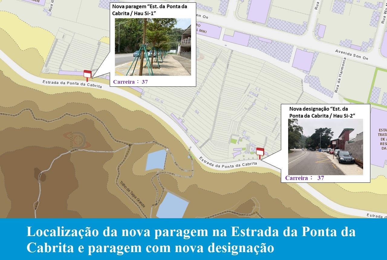 Respondendo às necessidades de deslocação do público, a Direcção dos Serviços para os Assuntos de Tráfego irá criar as paragens “Av. do Aeroporto/ Oficina do Metro Ligeiro”, “Av. do Aeroporto/Wynn Palace” e “Est. da Ponta da Cabrita / Hau Si-1”. As duas primeiras paragens mencionadas situar-se-ão na Avenida do Aeroporto, junto à oficina do Metro Ligeiro, permitindo escala à carreira n.º 51. A paragem “Est. da Ponta da Cabrita / Hau Si-1” localizar-se-á na Estrada da Ponta da Cabrita, junto ao Cemitério Hau Si e servirá para escala da carreira n.º 37. Estas três novas paragens entrarão em funcionamento no dia 5 de Setembro (Sábado).