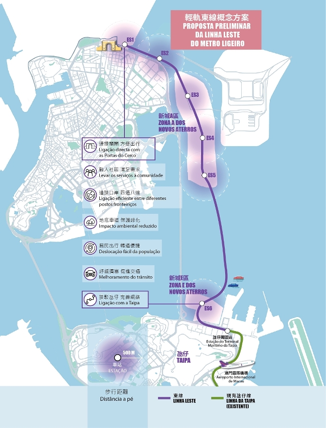 Relativamente ao «Projecto da Linha Leste do Metro Ligeiro», esta linha terá um comprimento proposto de cerca de 7,65 quilómetros, com as 6 estações e respectivos carris instalados no subsolo, partindo do zona norte, estendendo para sul para a Zona A dos Novos Aterros, passando pelo corredor verde central nesta zona e ligando as Zonas A e E através do túnel subaquático. Das estações construídas ao longo deste traçado, as primeiras duas ficam debaixo do leito marinho em frente às Portas do Cerco e à Avenida Norte do Hipódromo, enquanto as seguintes três se situam subterraneamente no corredor verde central da Zona A. Após a chegada à Zona E, o metro ligeiro circula no superfície e liga com o viaduto da Linha da Taipa, para que os passageiros possam fazer a correspondência directa. Após a conclusão da referida linha, prevê-se que a viagem entre as Portas do Cerco e o Terminal Marítimo da Taipa demore apenas 15 minutos, reduzindo, assim, o tempo da deslocação da população entre a Península de Macau e a Taipa. Além disso, será construída, em forma de túnel subaquático, a Linha Leste do Metro Ligeiro, não ocupando por isso o trânsito rodoviário existente durante o período da obra. Após a sua construção, é possível manter o funcionamento da mesma linha durante o mau tempo.