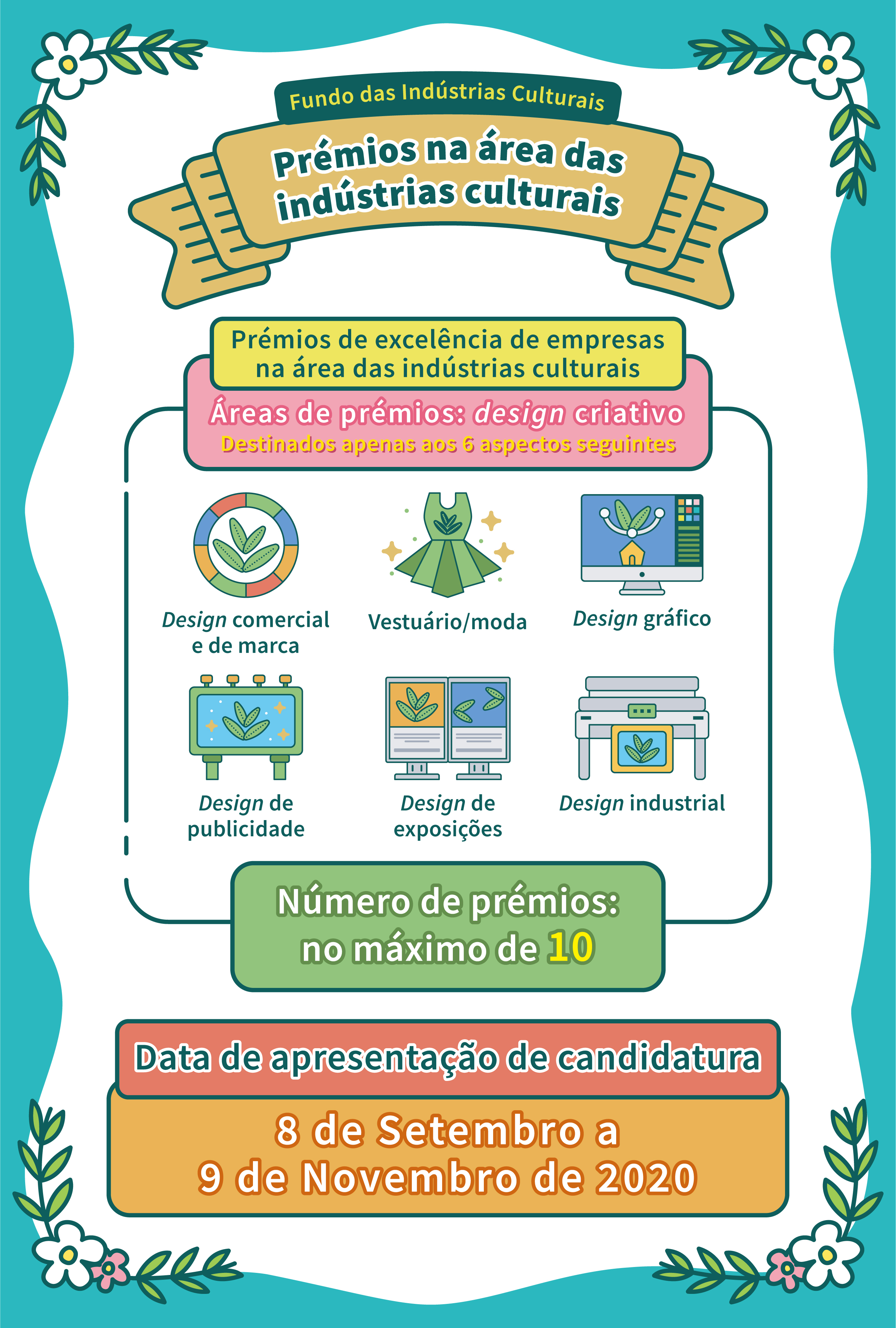 O Fundo das Indústrias Culturais (FIC) irá receber, no período de 8 de Setembro a 9 de Novembro, as candidaturas à 1.ª edição dos “Prémios na área das indústrias culturais, nomeadamente, os “Prémios de excelência de empresas na área das indústrias culturais” (adiante designados por “Prémios de excelência de empresas”), para a área de design criativo e os “Prémios de excelência de projectos na área das indústrias culturais” (adiante designados por “Prémios de excelência de projectos”), para a área de exposições e espectáculos culturais, sendo a avaliação e a selecção efectuadas pela Comissão de Avaliação das Candidaturas a Prémios. Aos premiados serão atribuídos o prémio pecuniário e o diploma de distinção, de modo a incentivar o desenvolvimento contínuo das indústrias, criando a marca de Macau.