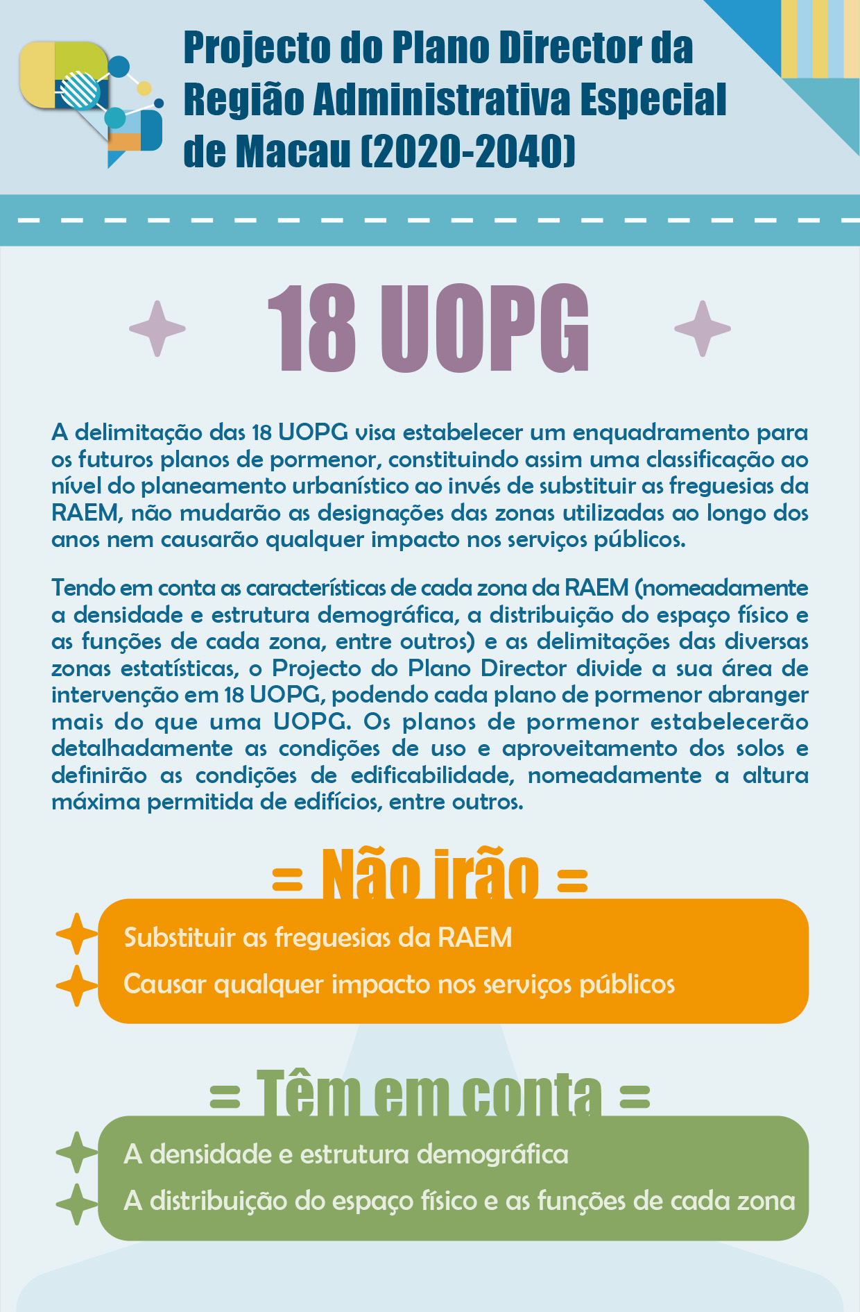 Está a decorrer por um período de 60 dias a consulta pública sobre o Projecto do Plano Director da Região Administrativa Especial de Macau (2020-2040). O projecto divide a sua área de intervenção em 18 unidades operativas de planeamento e gestão (UOPG) e define directrizes para melhor elaborar os futuros planos de pormenor. Através das directrizes do planeamento urbano de cada UOPG, procura-se potenciar e preservar as características de cada zona, assim como melhorar o ordenamento do espaço físico e optimizar as funções urbanas de cada UOPG do ponto de vista urbanístico. É de realçar que a delimitação das 18 UOPG visa estabelecer um enquadramento para os futuros planos de pormenor, constituindo assim uma classificação ao nível do planeamento urbanístico ao invés de substituir as freguesias da RAEM, não mudarão as designações das zonas utilizadas ao longo dos anos nem causarão qualquer impacto nos serviços públicos.