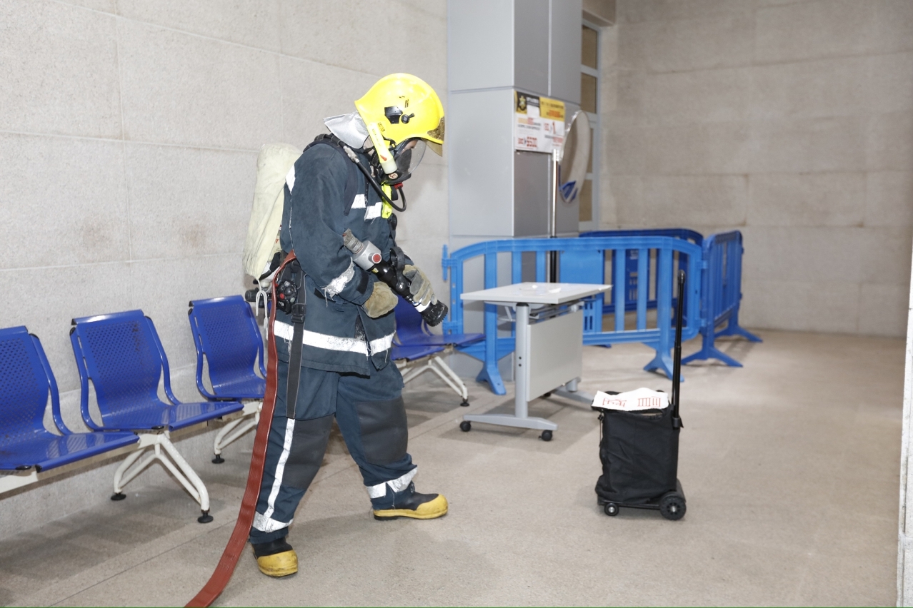 Durante o exercício, foi simulado a aparência de um caso de incêndio nos Serviços de Partidas junto do átrio de partidas do Edifício do Posto Fronteiriço das Portas do Cerco, enquanto um turista se encontrava a pagar a multa, a sua mala libertou fumo que pouco tempo depois, surgiu chamas, e em seguida a mala ficou rapidamente incendiada, o qual causou dois feridos. Os guardas no local tentaram extinguir o incêndio com o extintor, mas como a propagação do incêndio acelerou rapidamente, os guardas do piquete do Edifício do Posto Fronteiriço das Portas do Cerco ligaram logo ao CB e, ao mesmo tempo, de acordo com o mecanismo de comunicação, emitiram o comunicado aos outros serviços para prestarem apoio. A entidade policial adoptou as medidas de segurança de acordo com o plano de emergência estabelecido, evacuando as pessoas e os turistas do local para o ponto de encontro de evacuação.