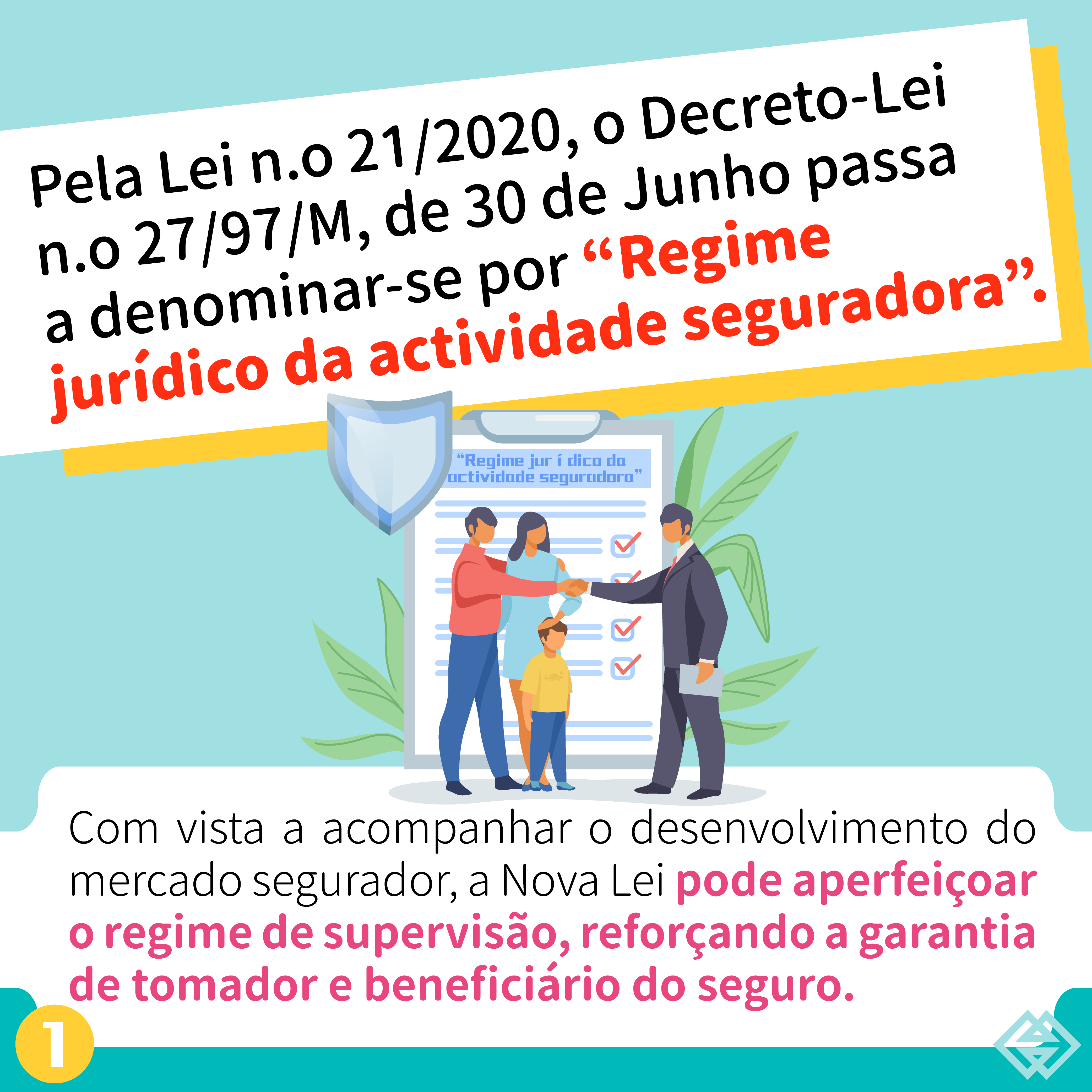 Mediante a Lei n.o 21/2020, o Decreto-Lei n.o 27/97/M, de 30 de Junho, passa a denominar-se por “Regime jurídico da actividade seguradora”. Em comparação com o Decreto-Lei vigente, o conteúdo objecto de revisão da presente lei consiste principalmente em: