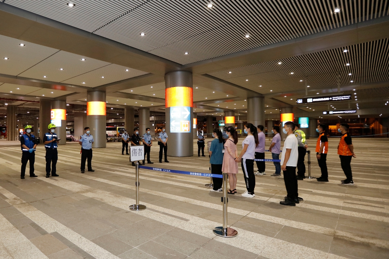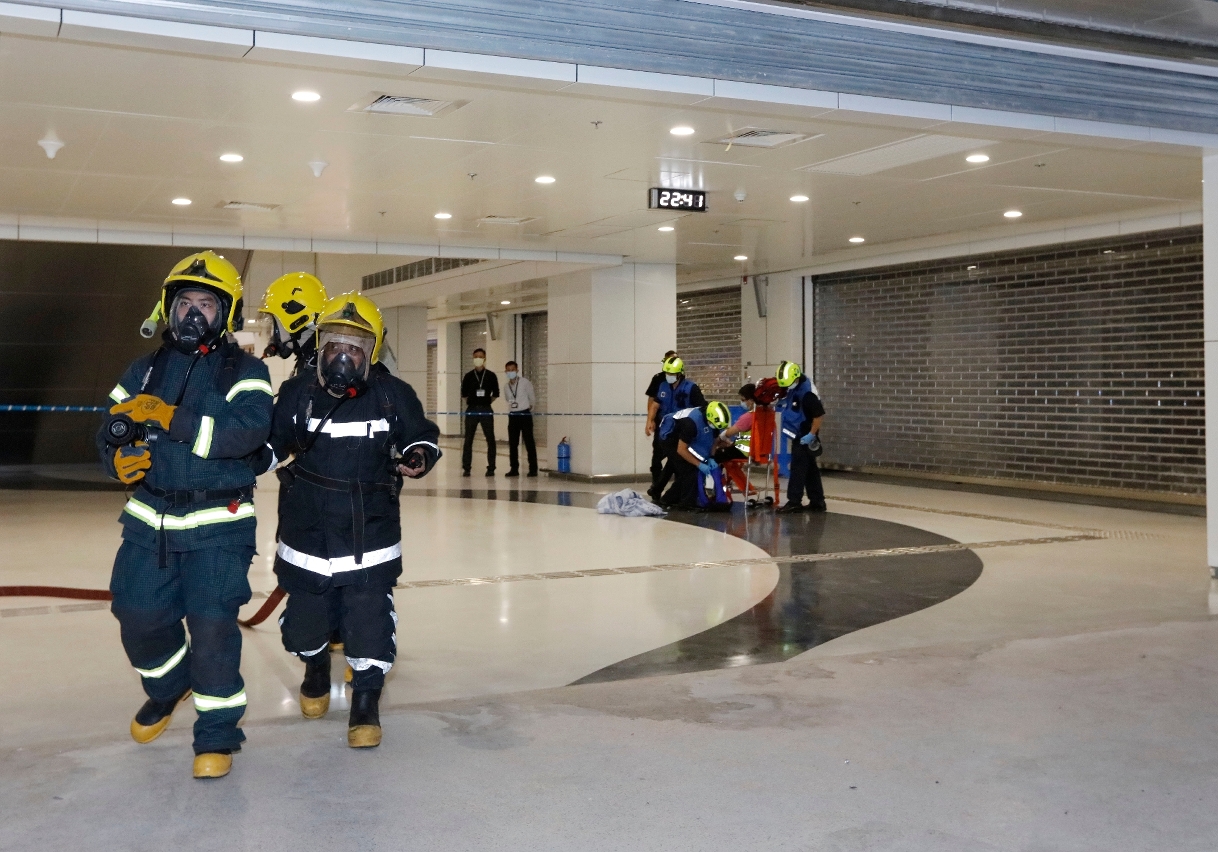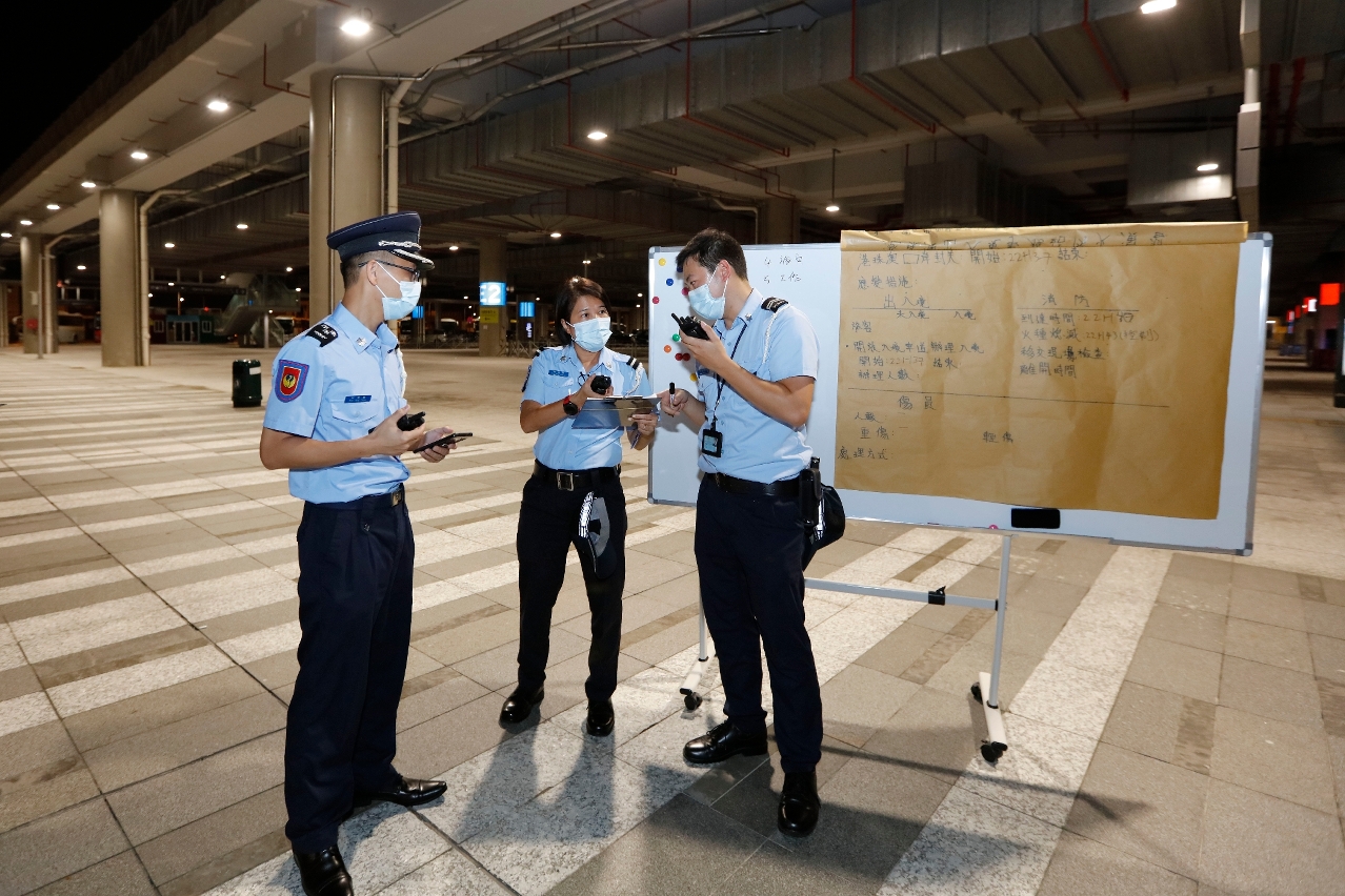 O exercício simulou um incêndio num estabelecimento de comida e bebida localizado na zona da restauração junto do rés-do-chão do átrio de chegadas do Edifício do Posto Fronteiriço de Macau da Ponte Hong Kong-Zhuhai-Macau. O segurança reparou que estava a libertar fumo no respectivo estabelecimento de comida e bebida que estava em obras, o qual provocou uma elevada quantidade de fumo. Um operador das obras do local sentiu-se mal por ter inalado fumo denso e ficou com queimadura leve ao tentar extinguir o fogo com o extintor e, de seguida, saiu do local de incêndio, esperando pelo resgate. O segurança notou da situação e ligou logo ao piquete do Edifício do Posto Fronteiriço da Ponte Hong Kong-Zhuhai-Macau. Os guardas do piquete ligaram imediatamente aos Serviços de Emergência 999, e em simultâneo, emitiram o comunicado de acordo com o mecanismo de comunicação definido no edifício e procederam rapidamente o plano de emergência de evacuação, nomeadamente avisar os serviços para se deslocarem e evacuarem os turistas até ao ponto de encontro, bem como encaminhar os turistas para tratarem das formalidades da passagem fronteiriça pela via de trânsito.