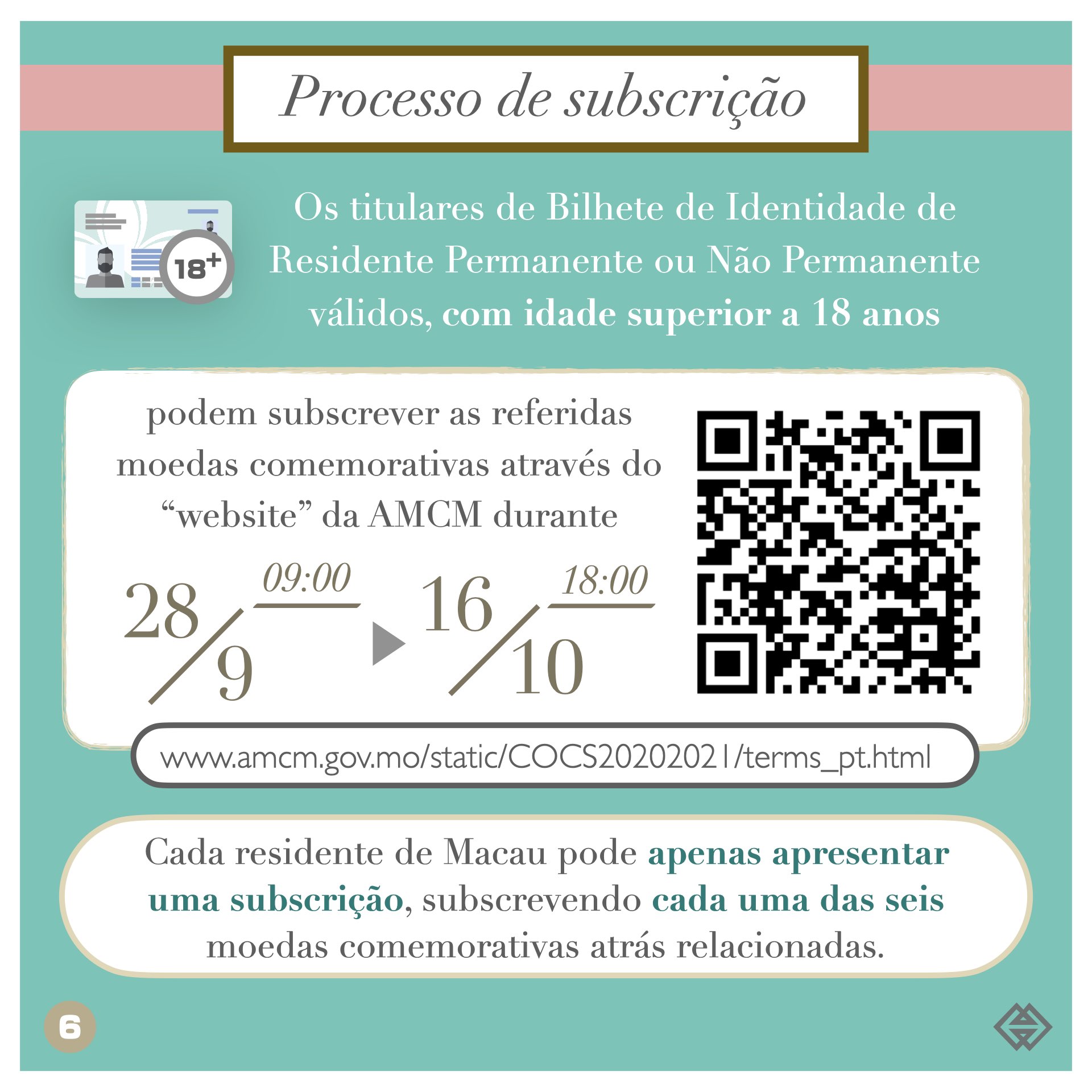 Os titulares de Bilhete de Identidade de Residente Permanente ou Não Permanente válidos, com idade superior a 18 anos, podem subscrever as referidas moedas comemorativas, das 9:00 horas do dia 28 de Setembro de 2020 às 18:00 horas do dia 16 de Outubro de 2020, através do “website” da AMCM ( https://www.amcm.gov.mo/static/COCS20202021/terms_pt.html ). Durante o período de subscrição supramencionado, será instalado um balcão, no “lobby” da AMCM, ao serviço dos cidadãos idosos que necessitem de assistência.