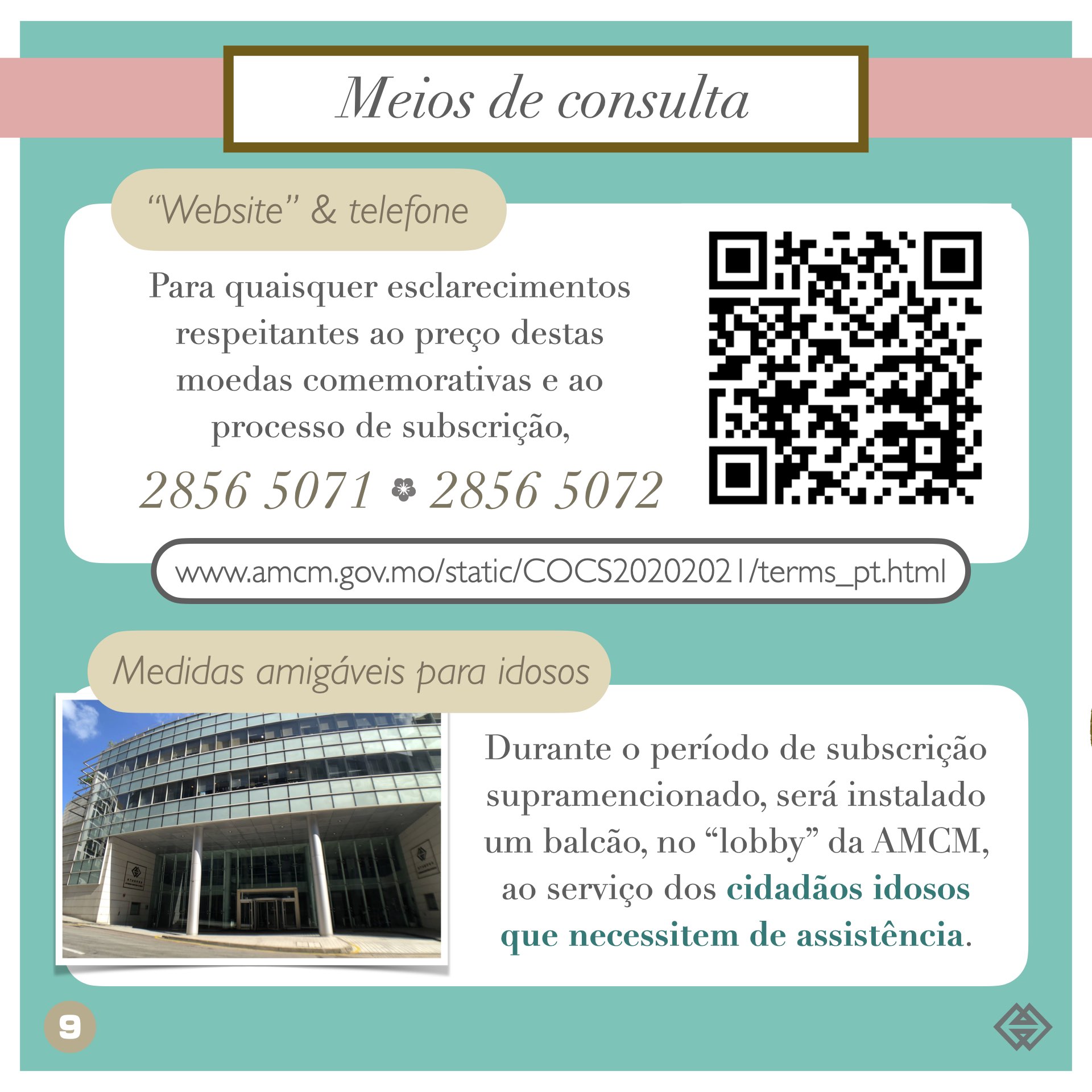 Para quaisquer esclarecimentos respeitantes ao preço destas moedas comemorativas e ao processo de subscrição, por favor queiram consultar o “website” da AMCM ( https://www.amcm.gov.mo/static/COCS20202021/terms_pt.html ) ou contactar a AMCM telefonicamente (2856 5071 ou 28565072).