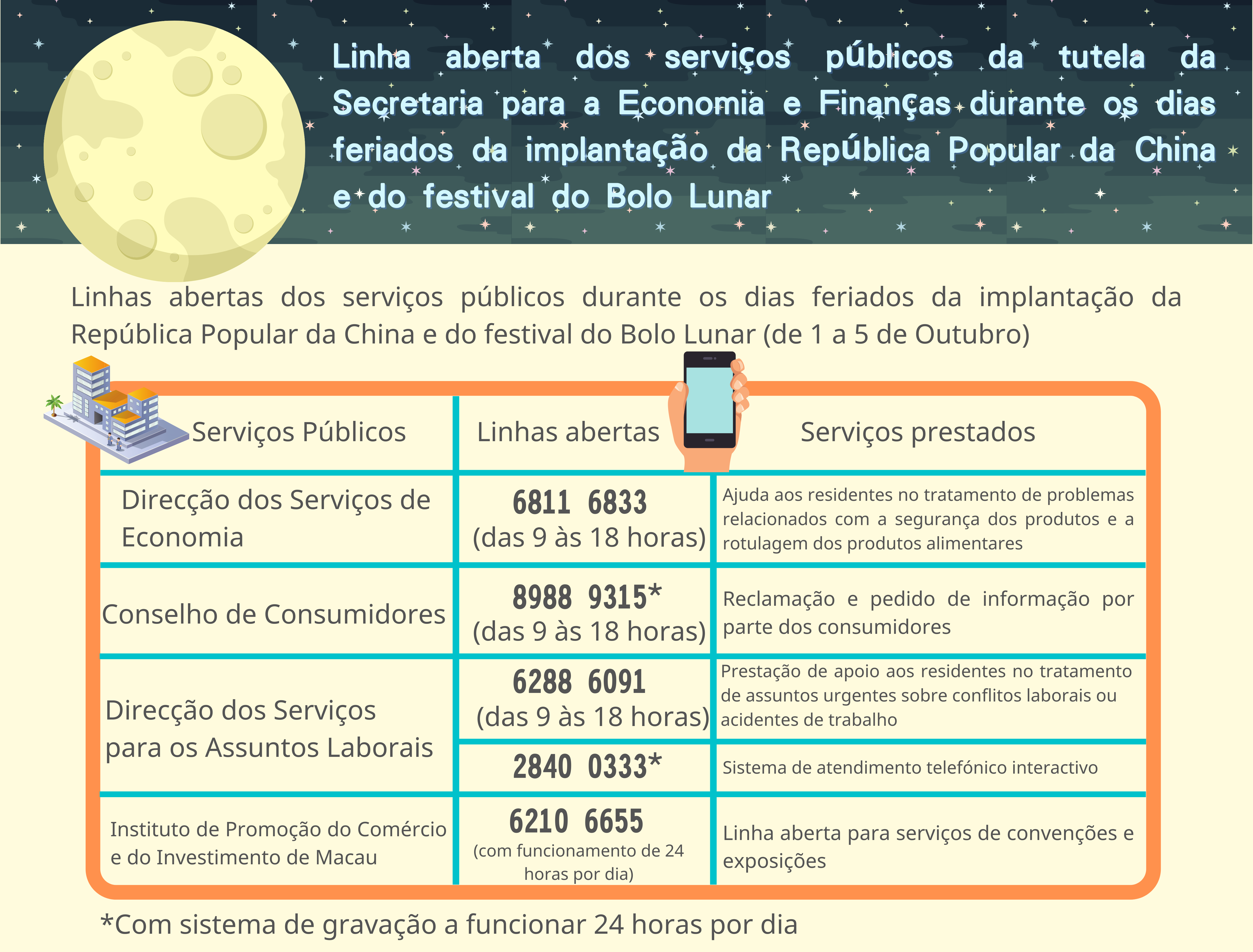 Durante os dias feriados da Implantação da República Popular da China e do Festival do Bolo Lunar, ou seja, entre 1 e 5 de Outubro, os serviços públicos da tutela da Secretaria para a Economia e Finanças irão criar linhas abertas para prestação de apoio e serviços aos residentes e visitantes: