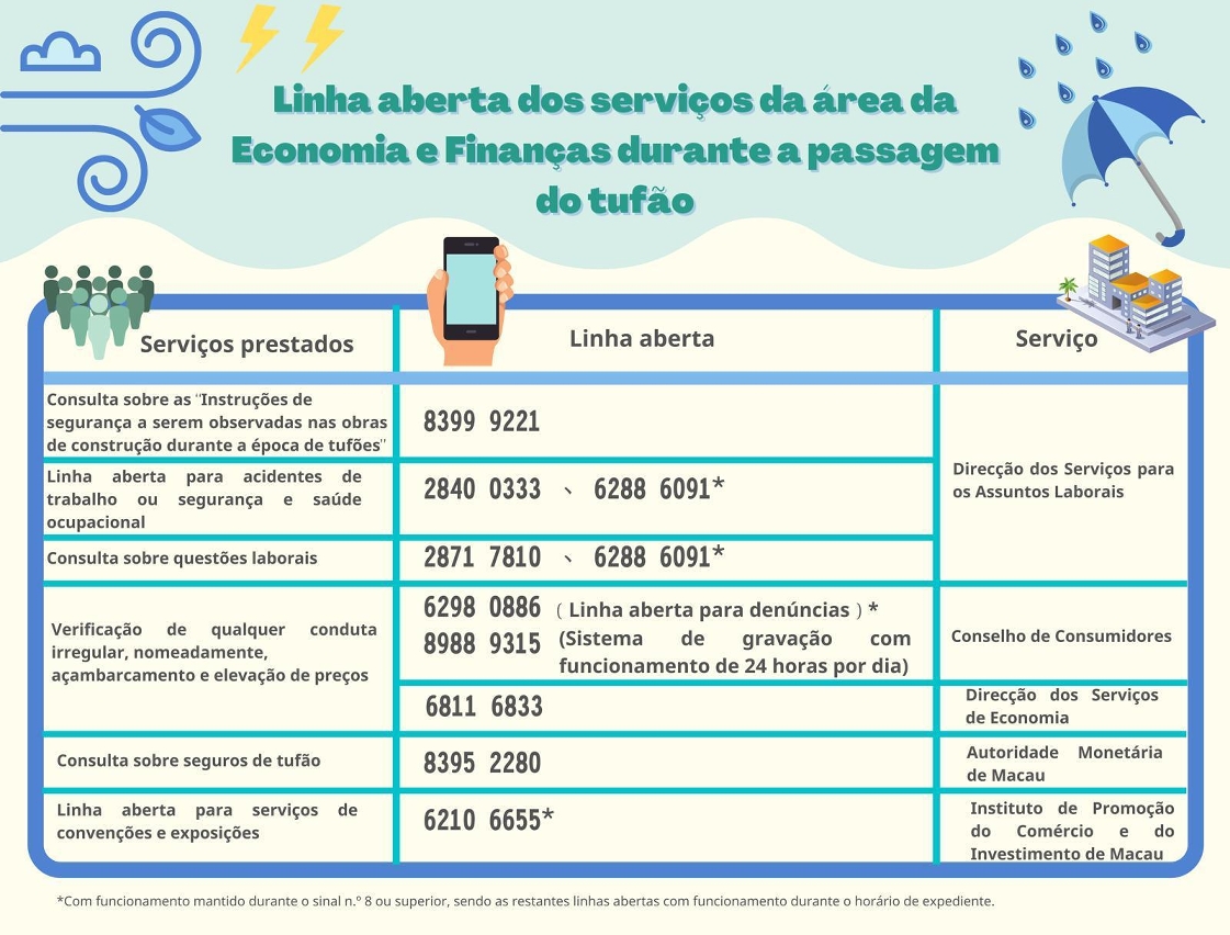 A Direcção dos Serviços para os Assuntos Laborais (DSAL) alerta às empresas que, quando for necessária a prestação do trabalho por parte dos trabalhadores durante o sinal n.º 8 ou superior de tufão, para além de adquirir a respectiva apólice de seguro laboral a favor desses trabalhadores, devem também proceder à organização da vinda e saída dos trabalhadores e às medidas no trabalho, ou seja, se a empresa possuir condições, deve ponderar a disponibilização de transporte para ida e volta dos trabalhadores, e proporcionar período e local de descanso adequados, para garantir a segurança dos mesmos, devendo ainda, ser compreensiva em relação ao trabalho árduo dos seus trabalhadores, atingindo uma compreensão mútua entre as partes. Para prestar apoio aos cidadãos no tratamento de assuntos urgentes sobre problemas laborais ou acidentes de trabalho, foi criada especialmente a linha de emergência 62886091, permitindo que os cidadãos contactem os trabalhadores da DSAL, para que lhes seja prestado, oportunamente, o devido apoio.