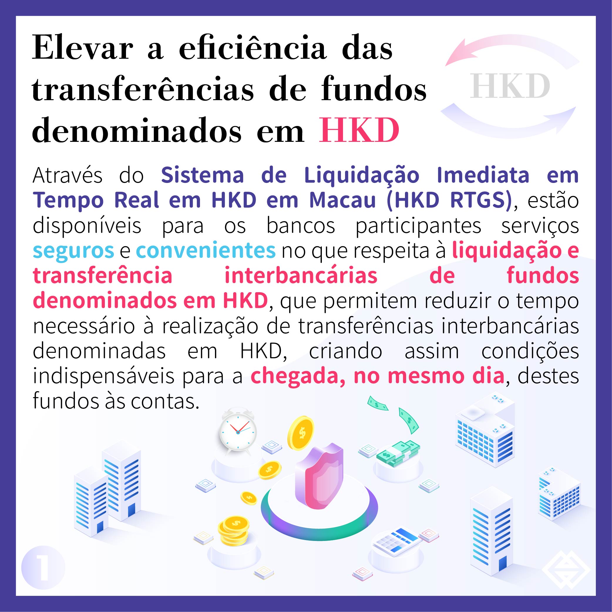 Com vista a promover a facilitação das operações de transferência de fundos e, na sequência dos projectos denominados “Sistema de Liquidação Imediata em tempo real em Patacas (MOP RTGS)” e “Sistema de Liquidação Imediata em tempo real em RMB (RMB RTGS)”, estabelecidos nos últimos anos, a que acresce o projecto “HKD RTGS”, que entrou, recentemente, em funcionamento, o Governo da RAEM ultimou a implementação dos três sistemas RTGS nas três moedas mais utilizadas em Macau. Neste contexto, com o “Sistema de Liquidação Automática de Cheques” e o “Sistema de pagamento eletrónico directo transfronteiriço Guangdong-Macau” a lançar até finais do ano em curso, estão disponíveis para os bancos as vias e canais de liquidação de fundos eficazes e seguros, apoiando os bancos no fornecimento aos clientes de serviços de transferências de fundos interbancárias e remessa de dinheiro transfronteiriça mais convenientes e seguros.