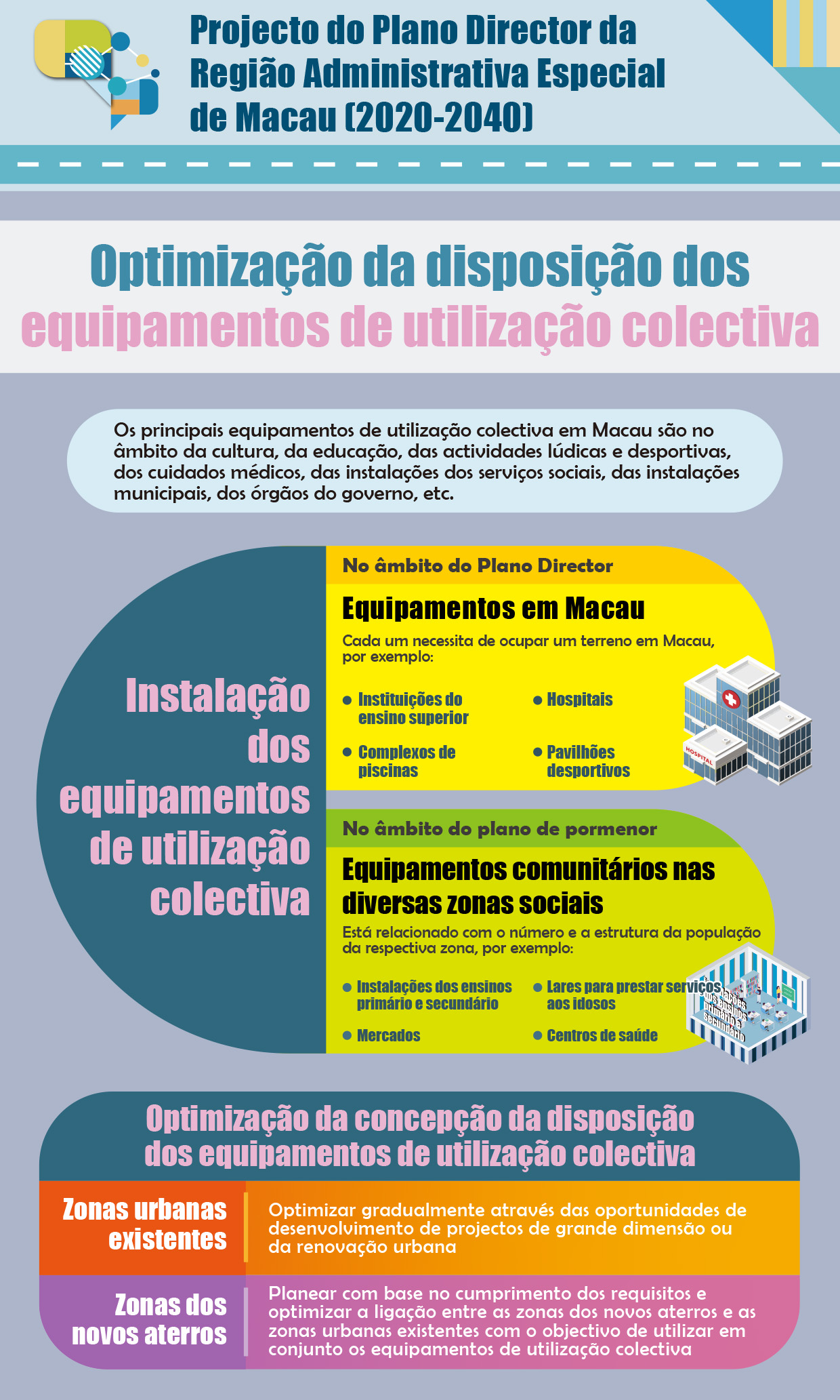 A fim de elevar de forma contínua a qualidade da vida global dos residentes e responder aos desafios causados pelo desenvolvimento sócioeconómico, pelo crescimento populacional futuro, pelo envelhecimento da população, etc., no projecto do “Plano Director da Região Administrativa Especial de Macau (2020-2040)” foi proposta a optimização da disposição dos equipamentos de utilização colectiva de Macau e a delimitação das respectivas zonas (zonas de equipamentos de utilização colectiva) no âmbito da cultura, da educação, das actividades lúdicas e desportivas, dos cuidados médicos, das instalações dos serviços sociais, das instalações municipais, dos órgãos do governo, etc., ocupando cada um desses equipamentos um terreno em Macau. Além disso, foi proposto que através da utilização conjunta dos respectivos equipamentos, da optimização da sua acessibilidade e ligação entre os mesmos e da ampliação do âmbito dos serviços para elevar o desenvolvimento urbano de uso misto, construir uma cidade habitável e tornar Macau a um lar feliz.