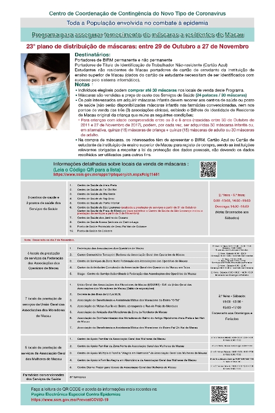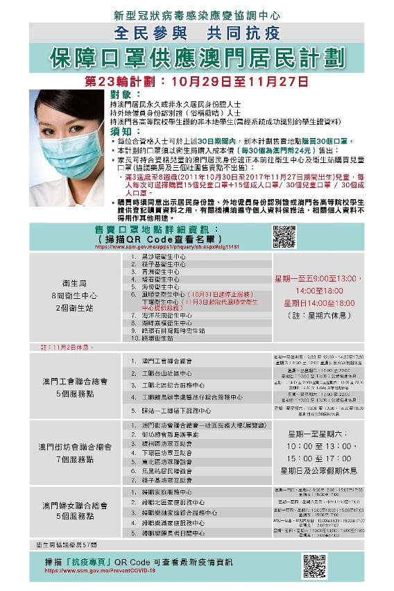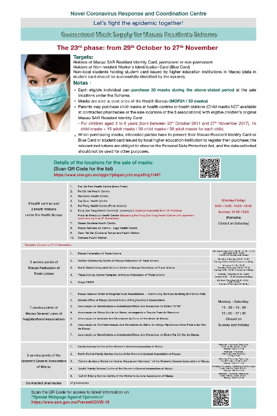 O Centro de Coordenação de Contingência do Novo Tipo de Coronavírus informa que a partir de quinta-feira, 29 de Outubro, terá inicio o 23.º plano de fornecimento de máscaras aos residentes de Macau.