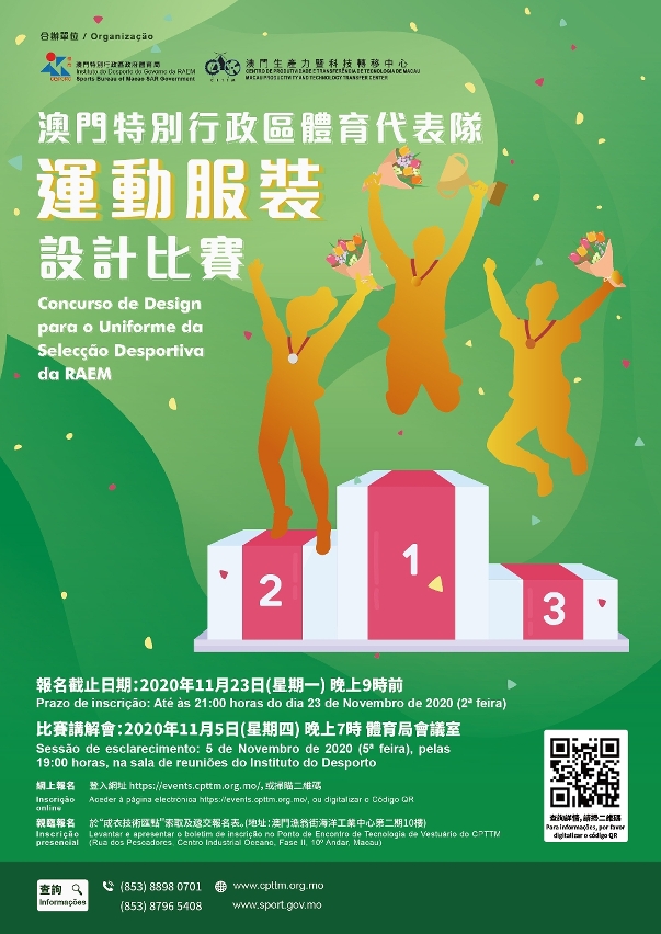 Organizado pelo Instituto do Desporto e pelo Centro de Produtividade e Transferência de Tecnologia de Macau, o Concurso de Design para o Uniforme da Selecção Desportiva da RAEM cujas inscrições encontram-se abertas a partir do dia 29 de Outubro, as obras vencedores terão a oportunidade de serem aplicadas no Uniforme da Selecção Desportiva de Macau.