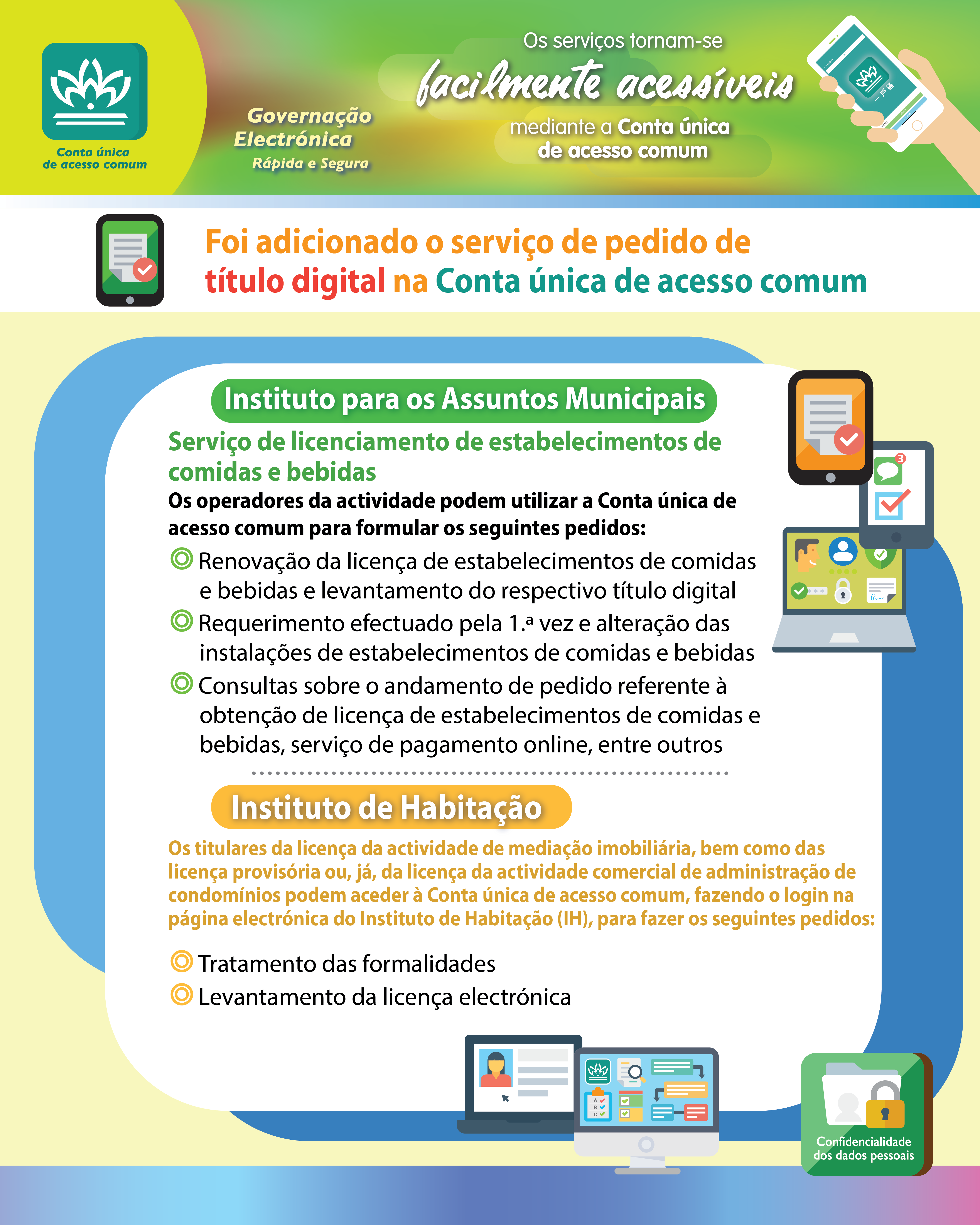 Também o serviço de renovação de licenciamento de estabelecimentos de comidas e bebidas do Instituto para os Assuntos Municipais encontra-se disponível na Conta única de acesso comum. Após requerimento e aprovação da licença, o requerente pode, mediante a Conta única de acesso comum, efectuar o pagamento da taxa inerente à renovação da licença e levantar o título digital da sua licença de estabelecimento de comidas e bebidas. Actualmente o serviço de licenciamento de estabelecimentos de comidas e bebidas disponibilizado na Conta única de acesso comum abrange também a possibilidade de apresentação dos documentos necessários para o requerimento formulado pela primeira vez e para o requerimento de alteração das instalações do estabelecimento, bem como a consulta do andamento do processo e o pagamento online, entre outras funcionalidades.