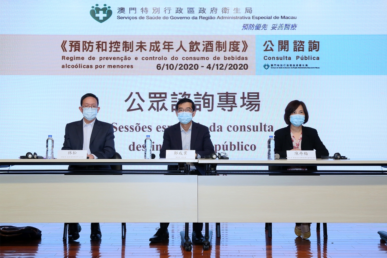 Durante a sessão, o subdirector dos Serviços de Saúde afirmou que “a situação do consumo de álcool entre os jovens é uma situação à qual o Governo da RAEM está a dar particular atenção e daí estar a monitorizar, de forma contínua, desde 2003 esta situação, incluindo a realização, de 5 em 5 anos, de um inquérito sobre os comportamentos de saúde dos estudantes do ensino secundário em Macau. Os resultados até agora obtidos identificam que em Macau, a situação de consumo de álcool entre os jovens de Macau apresenta uma tendência de subida”. O consumo de álcool por menores não só tem impactos graves para a saúde dos menores, mas também é um factor significativo no consumo nocivo de álcool após a maioridade. Assim, para assegurar a saúde dos jovens, reduzir a sua exposição ao consumo de bebidas alcoólicas, o Governo da RAEM iniciou a elaboração legislativa relativa ao controlo de bebidas alcoólicas. Este diploma tem como referência experiências internacionais e a situação real de Macau e visa legislar a proibição da venda ou o fornecimento de bebidas alcoólicas a menores.