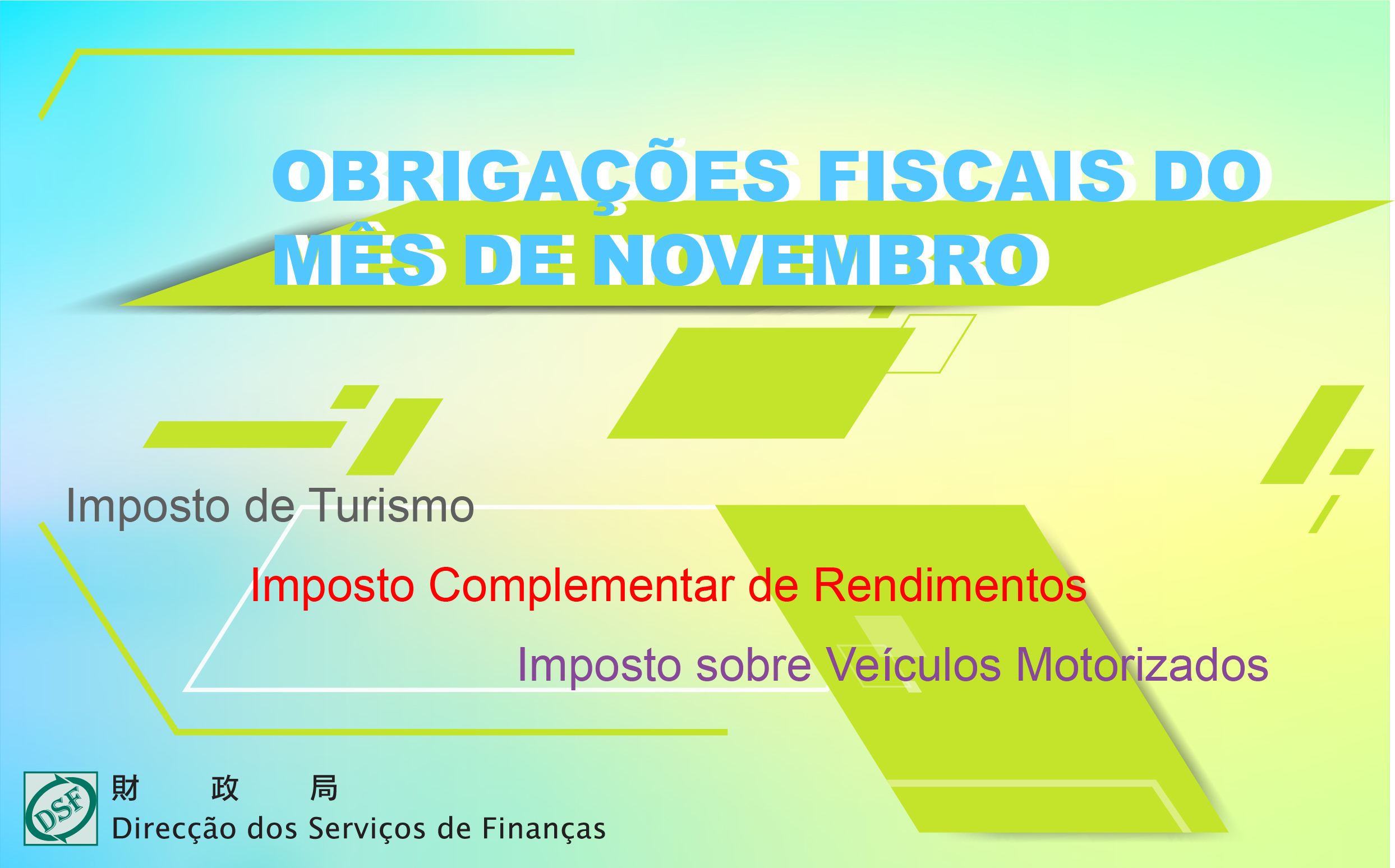 Entrega pelos hotéis, hotéis-apartamentos, complexos turísticos, restaurantes (incluindo "coffee-shop", "self-service" e similares), salas de dança (incluindo, nomeadamente "night-club", "discoteca", "dancing" e "cabaret"), bares (incluindo "pub" e "lounge") e estabelecimentos do tipo "health club", saunas, massagens e "karaokes", do imposto cobrado do mês anterior. (art.º 12.º da Lei n.º 19/96/M de 19 de Agosto) |