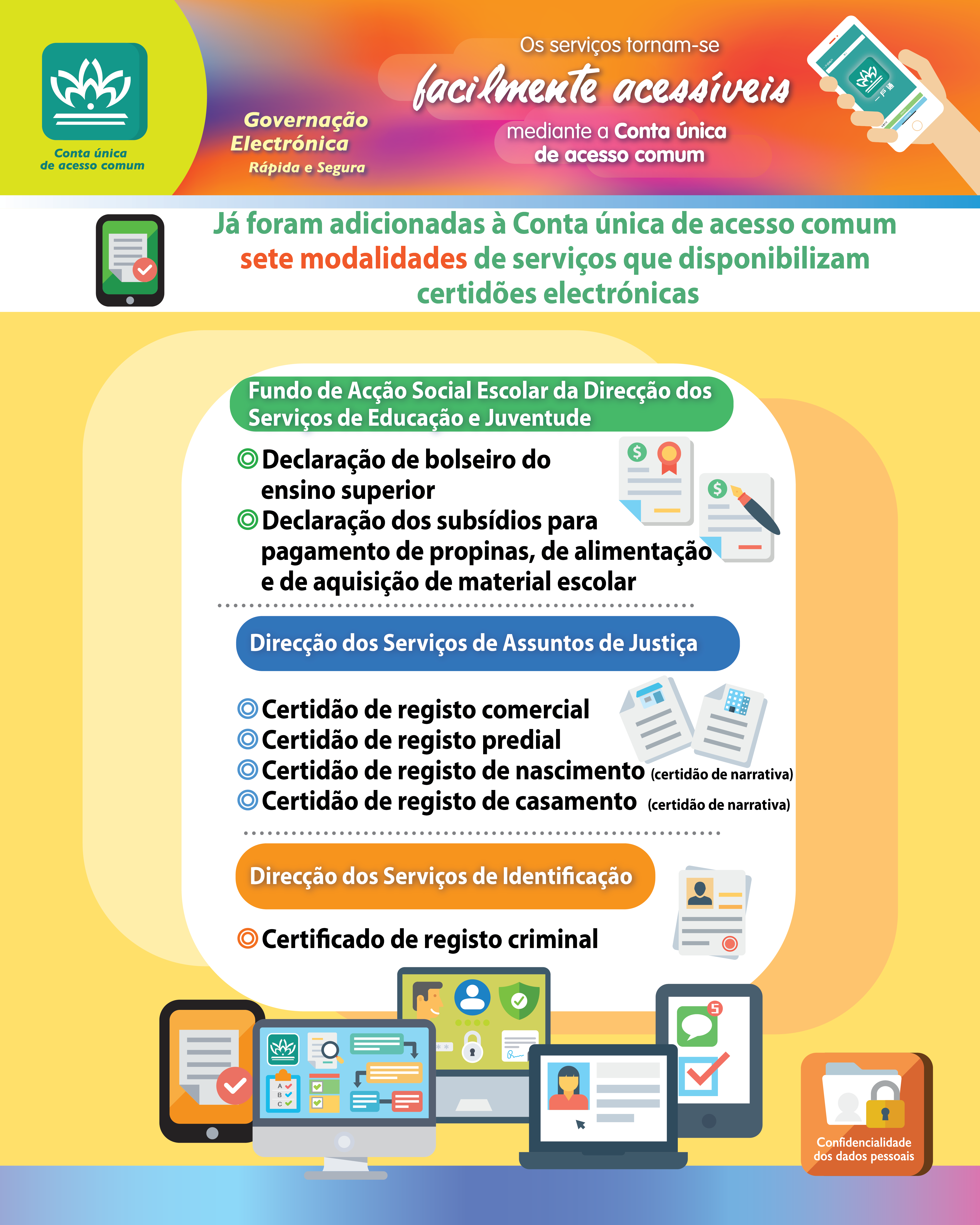 Também foram lançados na Conta única de acesso comum os serviços online do Fundo de Acção Social Escolar da DSEJ que respeitam aos pedidos de emissão da declaração de bolseiro do ensino superior e da declaração dos subsídios para pagamento de propinas, de alimentação e de aquisição de material escolar. Os requerentes terão, apenas, de preencher os dados necessários e submeter o pedido, e, finda a apreciação, serão notificados, por mensagem, correio electrónico ou por meio da Conta única de acesso comum, para efeitos de obtenção da devida declaração electrónica. O serviço é totalmente gratuito.