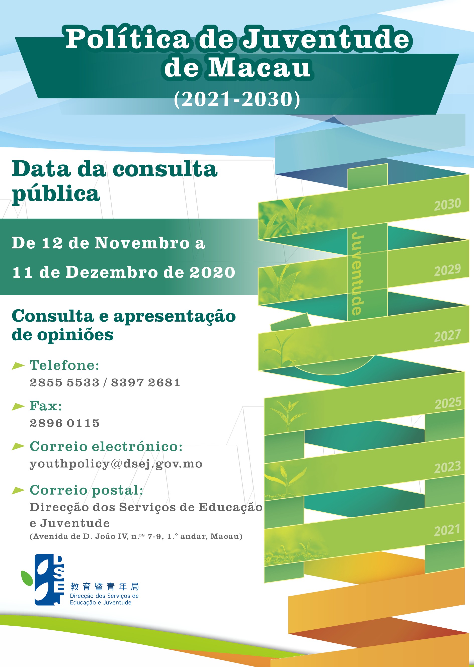 O documento de consulta da Política de Juventude de Macau (2021 – 2030) pode ser obtido no Centro de Informações ao Público, no Centro de Serviços da RAEM, na DSEJ e nos seus centros de actividades juvenis ou educativas, assim como, descarregado através da página oficial da DSEJ: www.dsej.gov.mo. Durante o período da consulta, serão realizadas 5 sessões específicas e os cidadãos, interessados em participar, podem inscrever-se através do website da DSEJ. Por outro lado, os cidadãos também podem submeter as suas opiniões através dos seguintes meios: