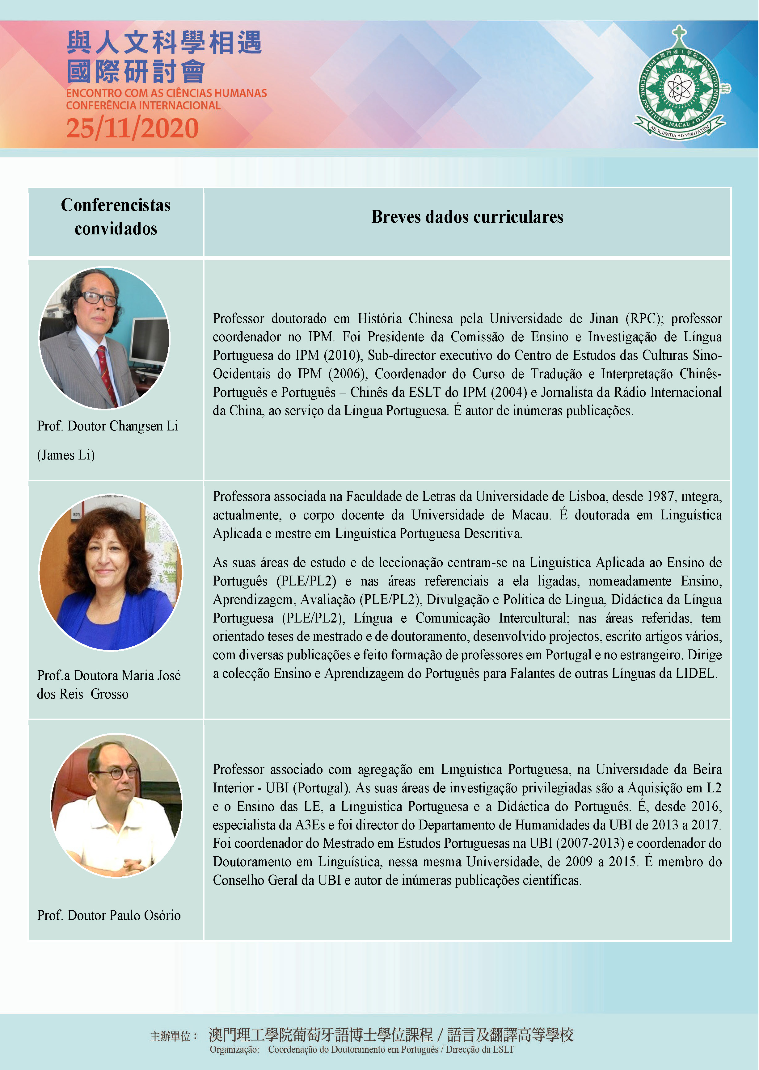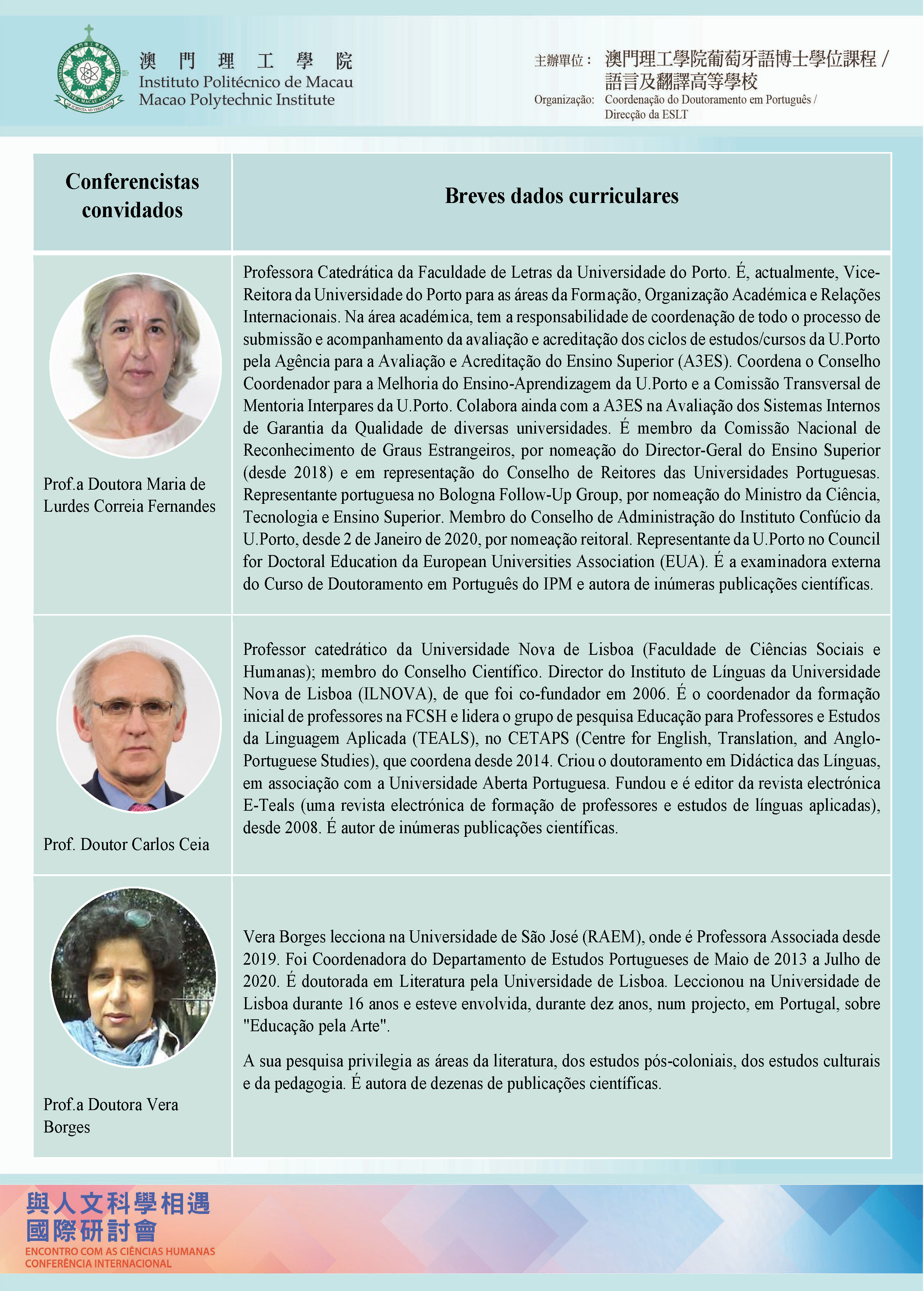 Destinado, primordialmente, a: i) Aprofundar a preparação científica dos estudantes do Doutoramento em Português do Instituto Politécnico de Macau (IPM), em diferentes áreas do saber; ii) Viabilizar a discussão de ideias com representantes reputados nas diferentes áreas científicas; iii) Dar aos estudantes e professores do Doutoramento em Português a possibilidade de criarem e/ou reforçarem “redes de conhecimento”de interesse para a sua investigação e iv) Contribuir para a internacionalização do IPM e a criação de laços empáticos com académicos de outras instituições do Ensino Superior, o evento conta com a participação de académicos consagrados e amplamente reconhecidos, como é o caso de Maria de Lurdes Correia Fernandes, Professora catedrática e vice-reitora da Universidade do Porto, especialista em Cultura e Literatura, Carlos Ceia, Professor catedrático da Universidade Nova de Lisboa, coordenador da Formação inicial de professores da Faculdade de Ciências Sociais e Humanas da Universidade Nova de Lisboa e coordenador do “Doutoramento em Didáctica das Línguas” dessa mesma Universidade (em colaboração com a Universidade Aberta de Portugal), Paulo Osório, Professor associado com agregação em Linguística Portuguesa, na Universidade da Beira Interior - UBI (Portugal) e especialista da A3Es, Maria José Grosso e Vera Borges, da Universidade de Lisboa e da Universidade de Macau, a primeira, e da Universidade de São José, a segunda, com um extenso currículo por todos conhecido em Macau e na China Interior. Ainda como conferencista especialmente convidado, aparece também Changsen Li (James Li), Professor coordenador do IPM, onde tem assumido diferentes responsabilidades científico-académicas e que possui uma rica e longa carreira de investigação e publicações.