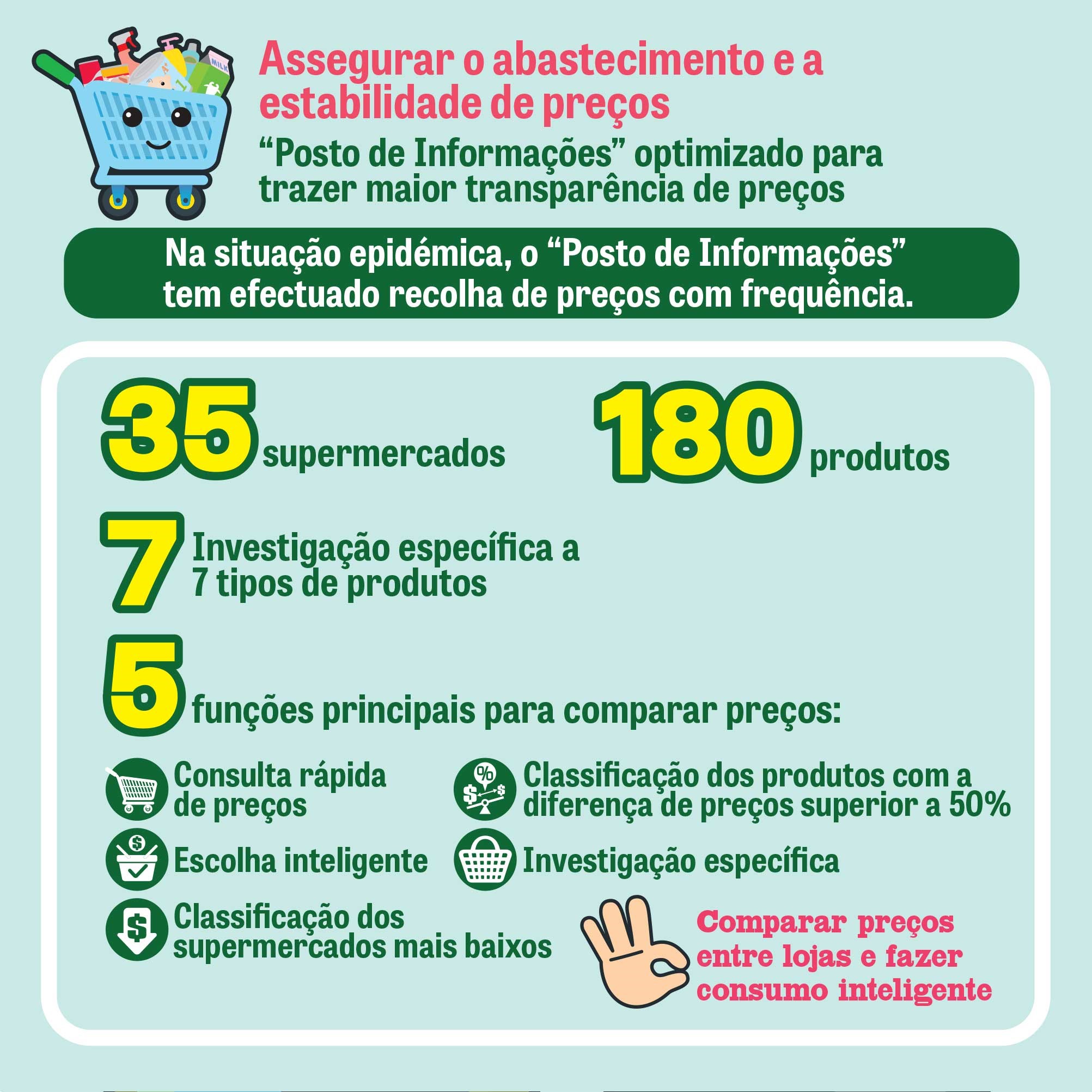 Os consumidores podem recorrer às 5 funções principais da aplicação informática do “Posto de Informações”, nomeadamente “Consulta rápida de preços”, “Escolha inteligente”, “Classificação dos supermercados mais baratos”, “Classificação dos produtos com a diferença de preços superior a 50%” e “Cesto de compras”, para fazer comparação de preços e consultar qual supermercado com mais produtos a preço mais reduzido sem sair de casa.