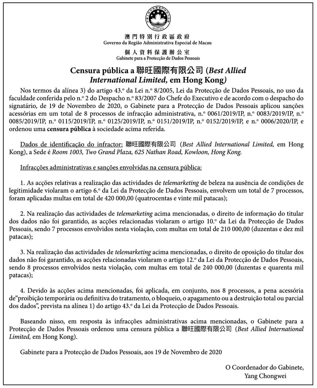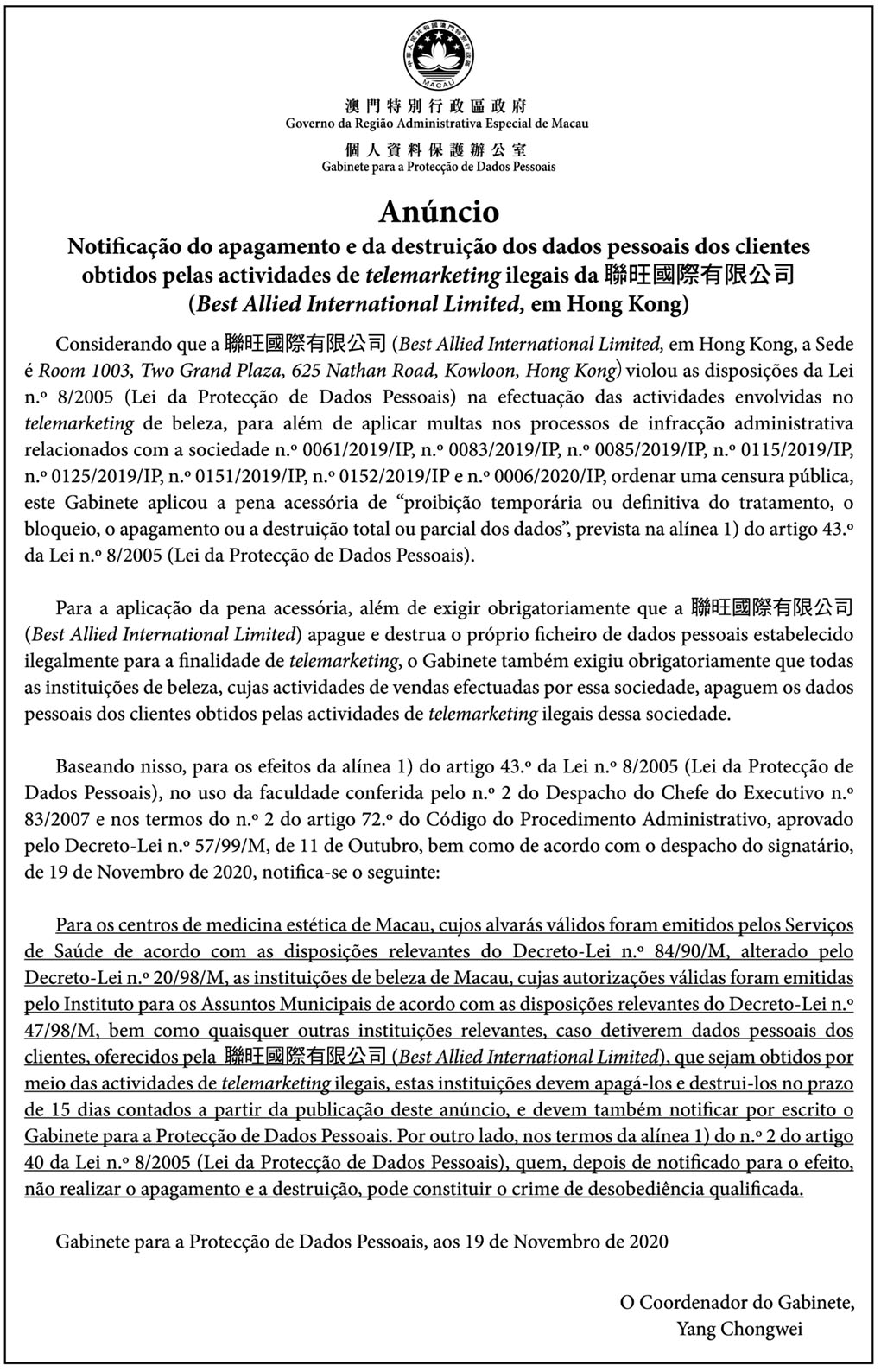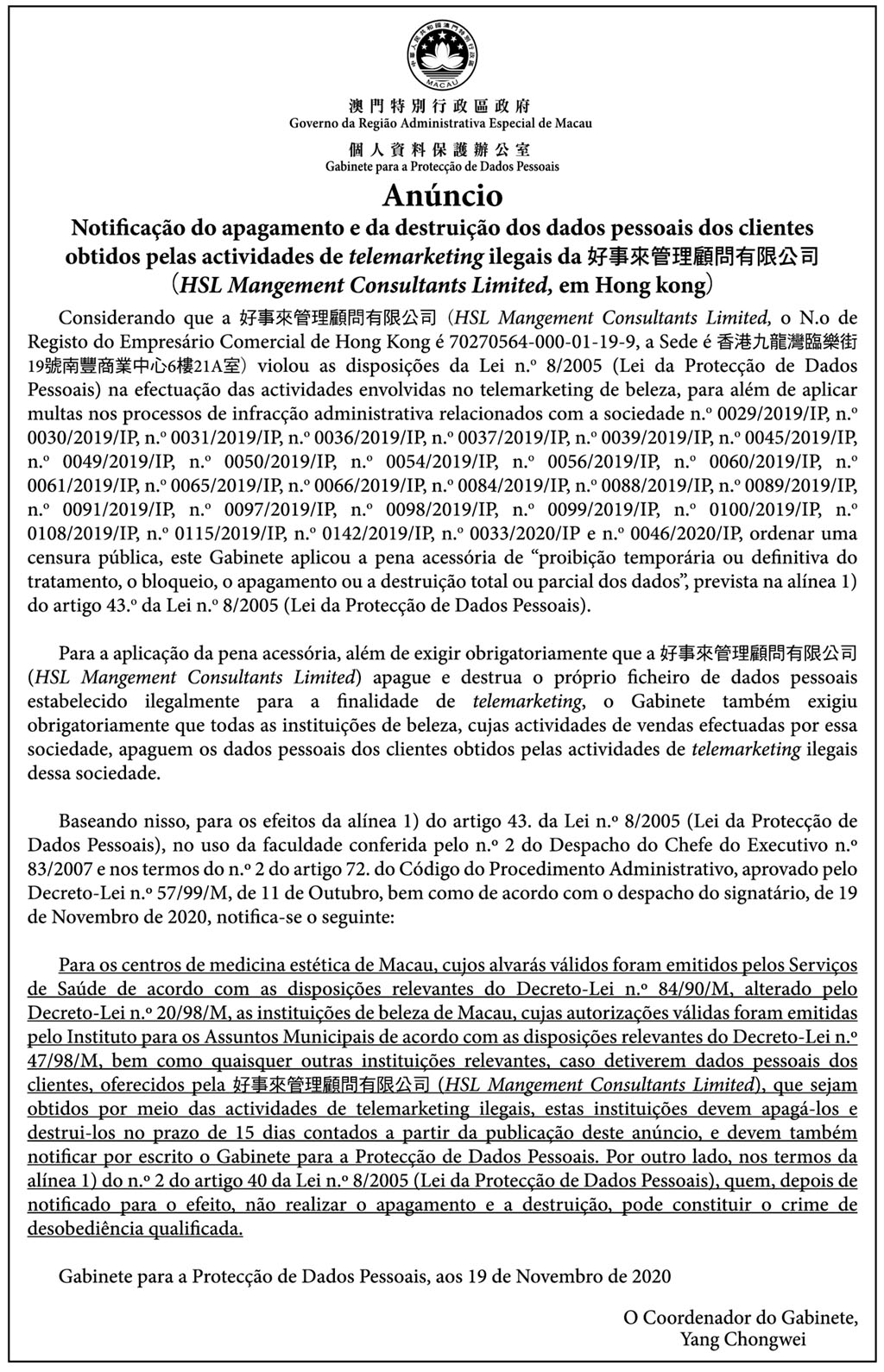 Relativamente ao assunto acima referido, o GPDP publicou, hoje, vários anúncios em dois jornais, um em língua chinesa e outro em língua portuguesa, tendo aplicado várias sanções acessórias e alertado as respectivas entidades para operarem nos termos da lei.