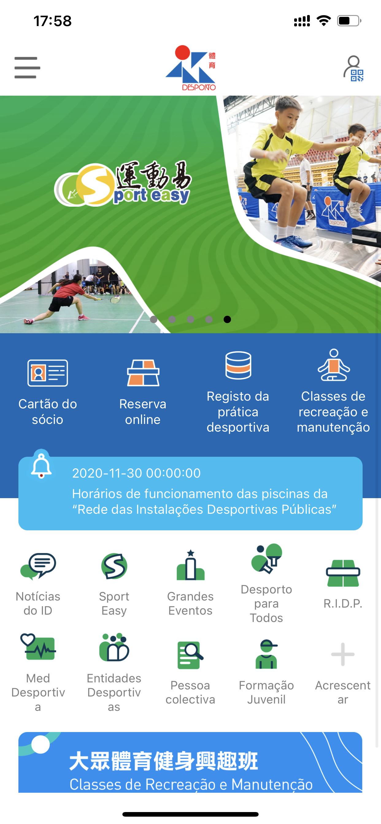 Em articulação com o trabalho da governação electrónica do Governo da Região Administrativa Especial de Macau, o Instituto do Desporto lança no dia 1 de Dezembro do corrente ano a nova aplicação de telemóvel. Esta aplicação acrescentou um conjunto de novas funções práticas, o cartão electrónico do Plano de sócio Sport Easy e o “Grupo familiar” de Sport Easy, por forma a prestar serviços aos sócios de Sport Easy de modo simples e conveniente.