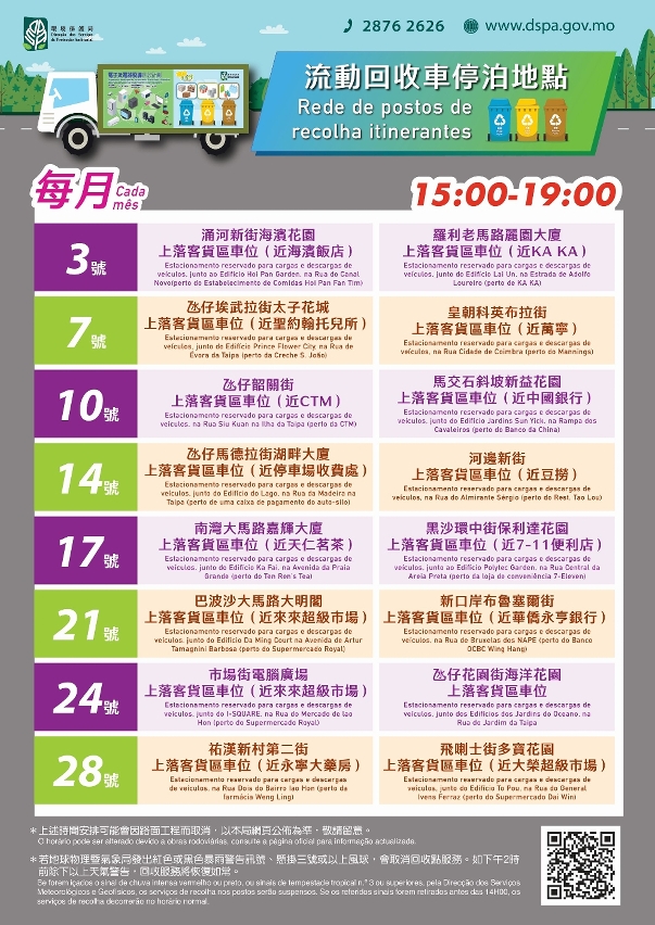 Por outro lado, foram aumentados, a partir de 7 de Novembro de 2020, os tipos de resíduos objectos das viaturas móveis de recolha, que circulam, mensal e periodicamente em 16 sítios de Macau (vide a figura anexada para pormenores), prestando serviços de recolha de resíduos por três cores (as garrafas de plástico, as latas de alumínio/ ferro e os resíduos de papel), garrafas de vidro, electrodomésticos grandes e pequenos, computadores e equipamentos de comunicação e baterias e lâmpadas usados.