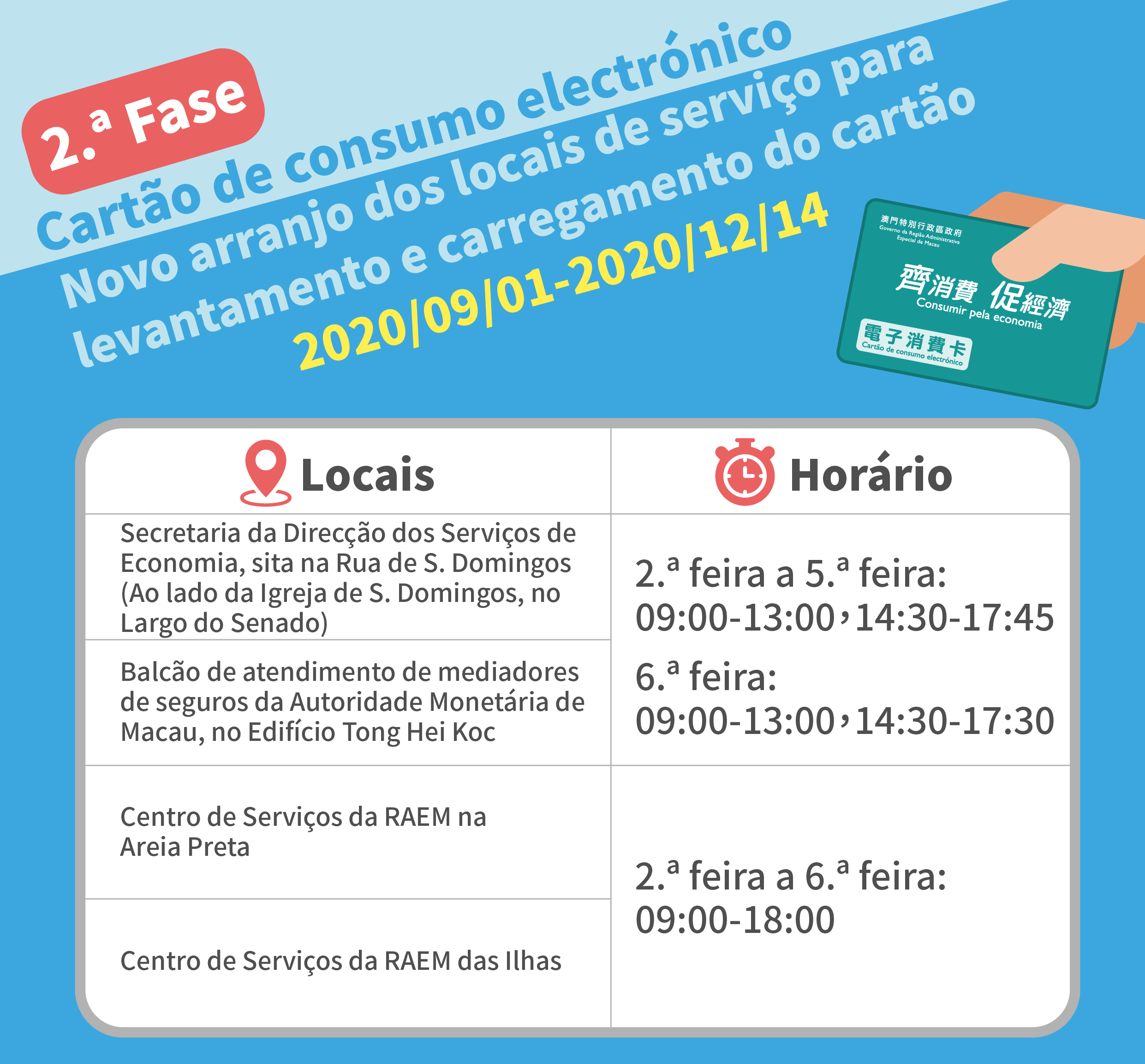 O prazo de levantamento do subsídio de consumo da 2ª fase terminará em 14 de Dezembro, pelo que, apela aos residentes que ainda não tenham levantado o subsídio de consumo da 2ª fase para o levantarem com a maior rapidez possível, durante as horas de expediente, a um dos seguintes 4 postos de atendimento dos serviços públicos, para efeitos de carregamento ou levantamento do cartão:
