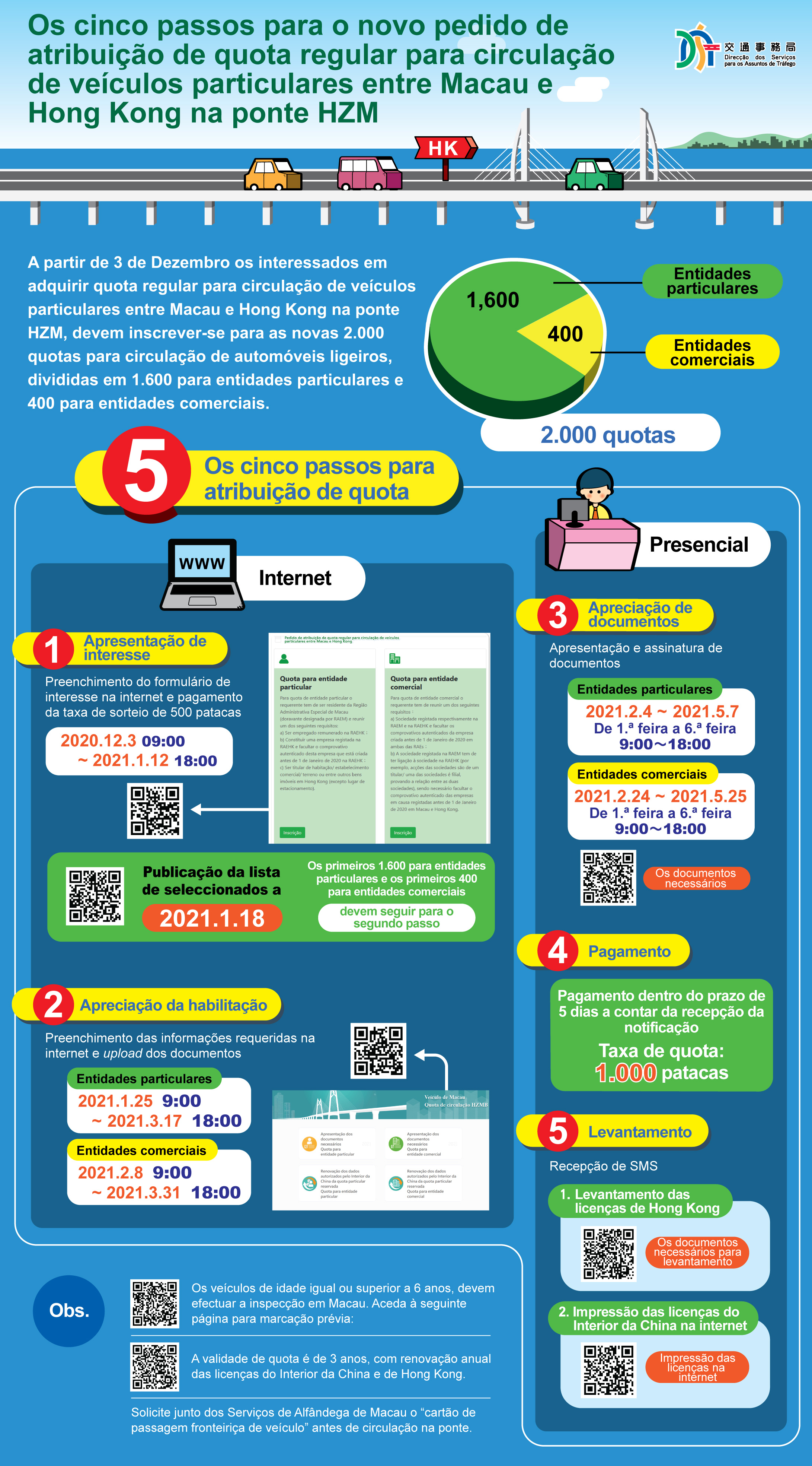 A quota permite aos automóveis ligeiros de passageiros registados na RAEM e para fins particulares, a realização de múltiplas viagens entre Macau e Hong Kong pela Ponte Hong Kong-Zhuhai-Macau no prazo de 3 anos. Para informações relativas às formalidades administrativas consulte a página electrónica: https://www.gov.mo/zh-hant/services/ps-2021/ps-2021a/.