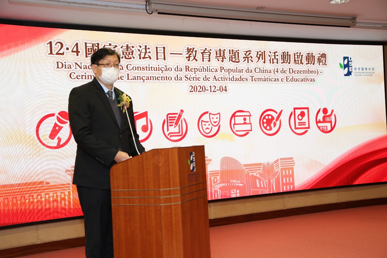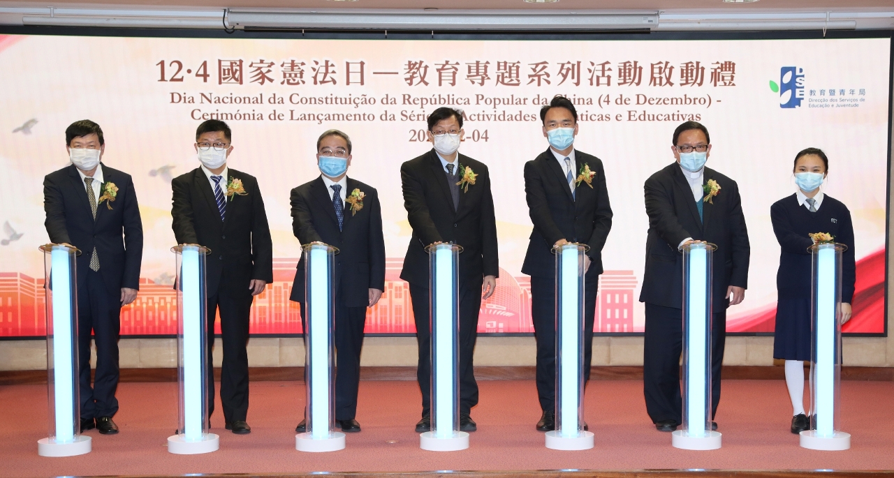 Para celebrar o Dia Nacional da Constituição, a Direcção dos Serviços de Educação e Juventude (DSEJ) lançou o evento “Dia Nacional da Constituição da República Popular da China - Série de Actividades Temáticas e Educativas”, que decorre entre os dias 30 de Novembro e 11 de Dezembro deste ano. Neste âmbito, no dia 4 de Dezembro, Dia Nacional da Constituição, no Salão de Conferências Confúcio, no 1.º andar da sede da DSEJ, teve lugar a actividade “Dia Nacional da Constituição da República Popular da China - Cerimónia de Lançamento da Série de Actividades Temáticas e Educativas”, que contou com a presença do Director da DSEJ, Lou Pak Sang, do Subchefe do Departamento de Educação e Assuntos de Juventude do Gabinete de Ligação do Governo Central na Região Administrativa Especial de Macau, Gou Renmin, do Subdirector da DSEJ, Kong Chi Meng, do Presidente da Direcção da Associação de Educação de Macau, Cheang Hong Kong, do Presidente da Direcção da Associação das Escolas Católicas de Macau, Joseph Chow Pak Fai, do Presidente da Assembleia Geral da Associação Educativa da Função Pública de Macau, Cheang Wai Seng, de directores escolares e de representantes das escolas.