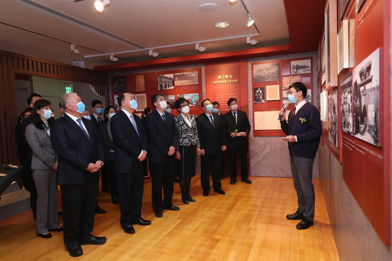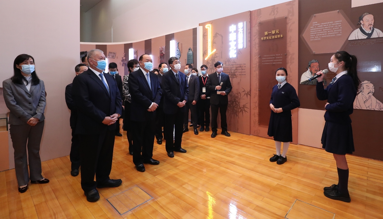 A Base da Educação do Amor pela Pátria e por Macau para Jovens dispõe de uma exposição educativa permanente, denominada “Raiz ligada à China”, que está subordinada a três temas principais - “A Profunda Cultura Chinesa”, “A Resistência e A Salvação do Povo Chinês” e “A Realização da Modernização de Renome Mundial”. O Chefe do Executivo, Ho Iat Seng, e os convidados visitaram a Base da Educação do Amor pela Pátria e por Macau para Jovens e foram guiados por representantes dos alunos e dos jovens que participaram no Concurso de discursos “Eu, a Constituição e a Lei Básica”, no Concurso sobre os Conhecimentos Diplomáticos dos Jovens de Macau e nas Equipas Escolares do Içar da Bandeira.