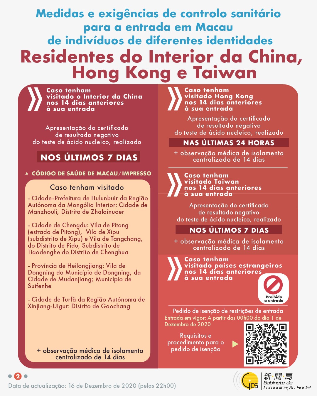 Medidas e exigências de controlo sanitário para a entrada em Macau de indivíduos de diferentes identidades
