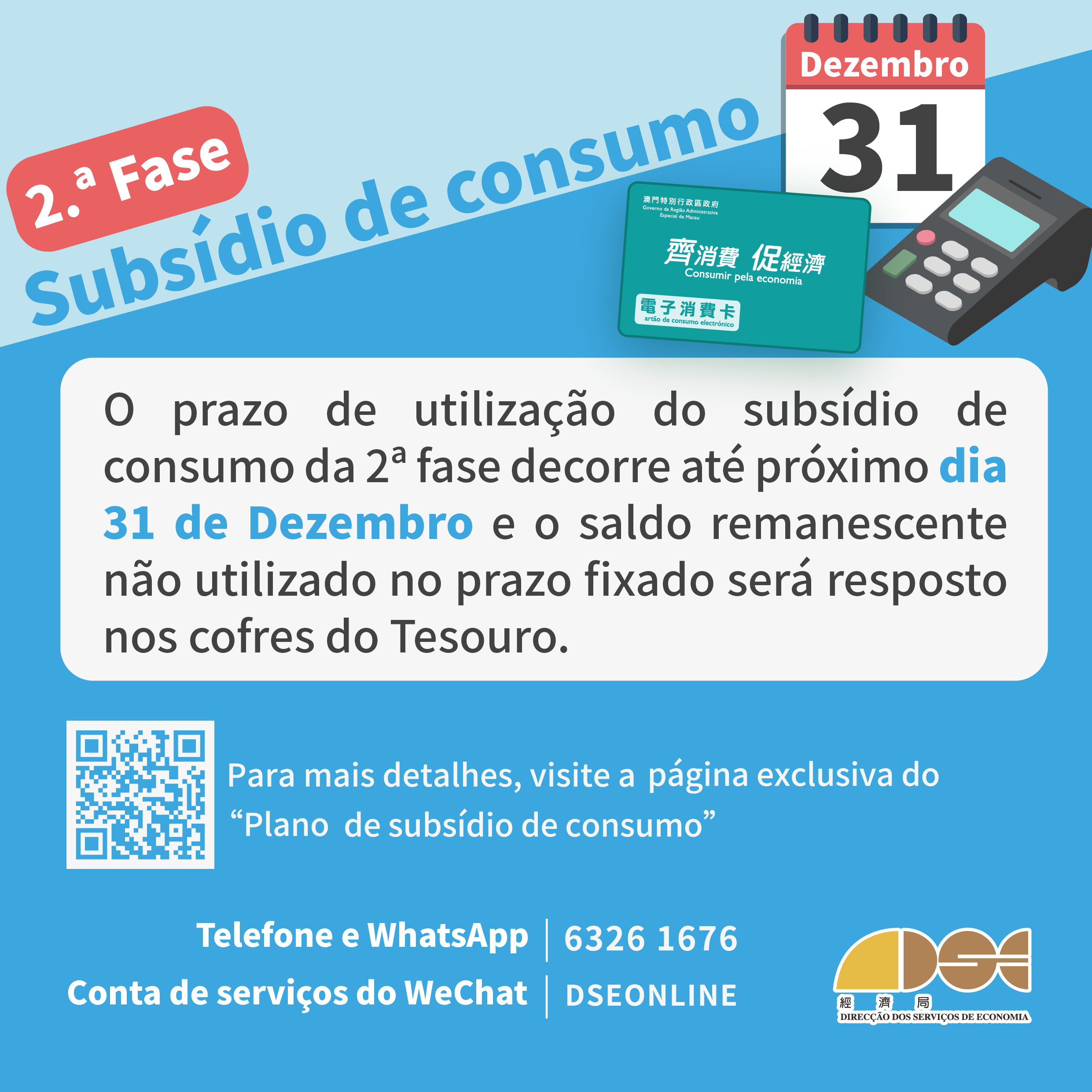 O prazo de utilização do subsídio de consumo da 2ª fase decorre até próximo dia 31 de Dezembro. Assim, o Governo da RAEM apela aos residentes que levantaram o respectivo subsídio para que o mesmo seja utilizado atempadamente, e o saldo remanescente não utilizado no prazo fixado será resposto nos cofres do Tesouro.