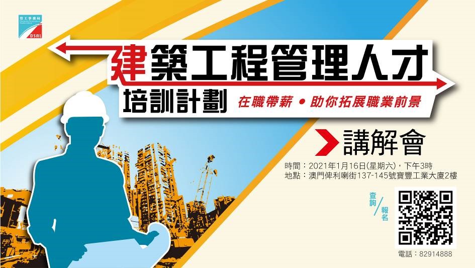 Para uma melhor compreensão, por parte dos jovens sobre a situação do sector e do Plano de formação de quadros na área da construção e a situação do sector da construção, a DSAL irá organizar, no dia 16 de Janeiro de 2021 (sábado), pelas 15:00, no 2.º andar do Edifício Industrial Pou Fung, sito na Rua de Francisco Xavier Pereira 137-145, uma sessão de esclarecimento sobre o Plano de formação de quadros na área da construção. Serão convidados para a sessão de esclarecimento, representantes do sector das obras e da construção para fazer uma apresentação sobre a indústria bem como para partilhar experiências, pelo que serão bem-vindos a participar os jovens de Macau interessados nesta matéria. Os interessados podem aceder ao seguinte link https://www.dsal.gov.mo/elearning/public/index.html#/question?code=dHlwZT1wdWJsaWMmaWQ9MTA para inscrição, antes do dia 13 de Janeiro de 2021. Tendo em consideração os trabalhos de prevenção da pandemia, é estipulado um limite de participantes e só serão aceites inscrições mediante marcação prévia. A inscrição termina logo após esgotadas as vagas. Para mais informações, queira contactar esta Direcção de Serviços através do telefone número 82914888 e para o regulamento do aludido Plano a página electrónica da DSAL ( www.dsal.gov.mo ).
