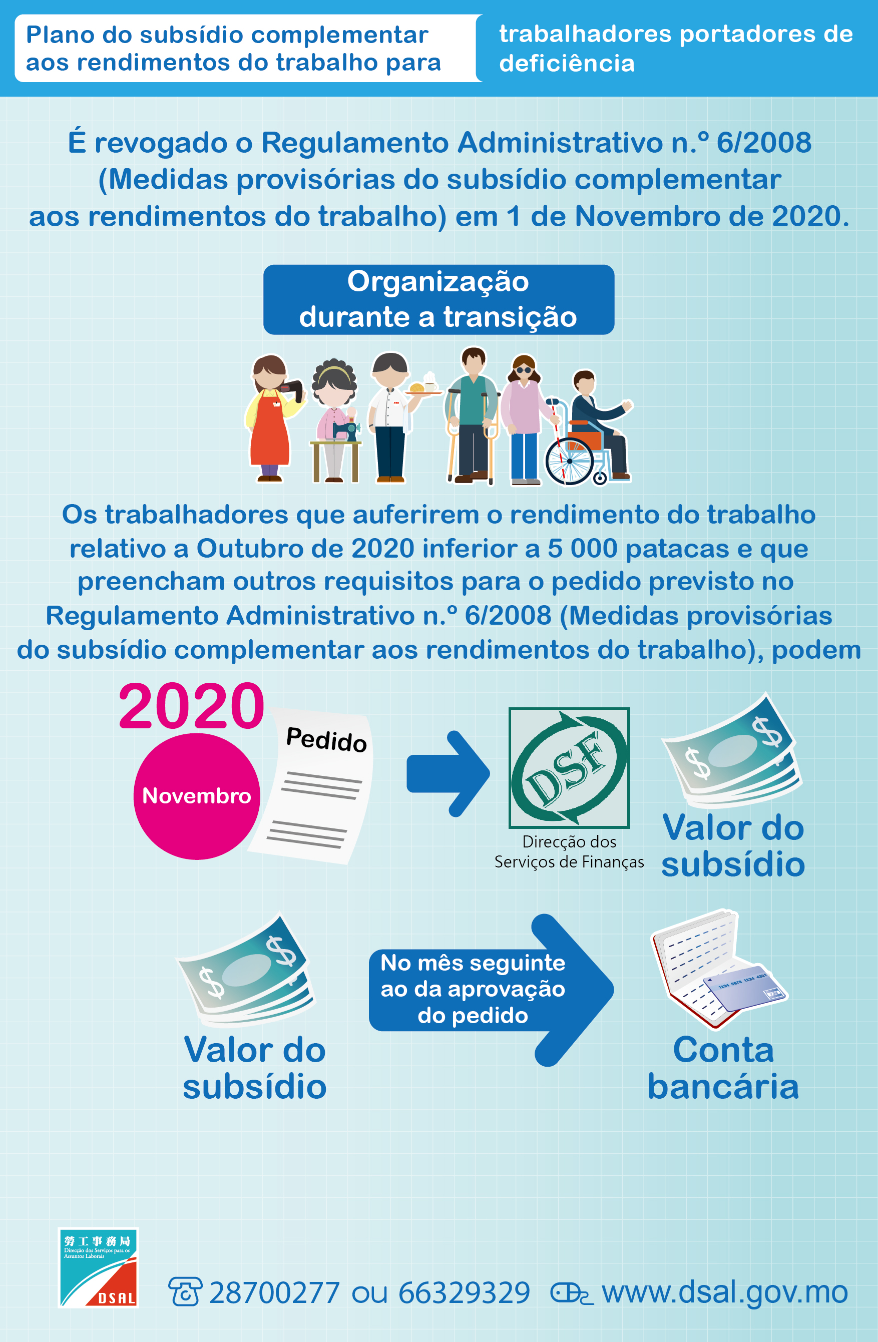 Para mais informações sobre o Plano do subsídio complementar aos rendimentos do trabalho para trabalhadores portadores de deficiência, queira consultar a página electrónica ( https://www.dsal.gov.mo/zh_tw/standard/disability_income_subsidy.html ), ou contacte esta Direcção de Serviços através do telefone sob número 28700277 ou 66329329.
