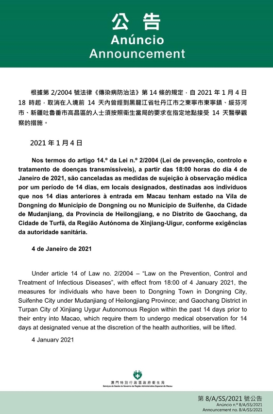O Centro de Coordenação de Contingência do Novo Tipo de Coronavírus informa que, em resposta à mais recente evolução da situação epidémica na Província de Heilongjiang e na Região Autónoma de Xinjiang-Uigur, a partir das 18:00 horas do dia 4 de Janeiro de 2021 os Serviços de Saúde cancelam, nos termos do artigo 14.º da Lei n.º 2/2004 (Lei de prevenção, controlo e tratamento de doenças transmissíveis), as medidas de observação médica por um período de 14 dias, em locais designados, destinadas aos indivíduos que nos 14 dias anteriores à entrada em Macau tenham estado na Vila de Dongning do Município de Dongning ou no Município de Suifenhe, da Cidade de Mudanjiang, da Província de Heilongjiang, bem como no Distrito de Gaochang, da Cidade de Turfã, da Região Autónoma de Xinjiang-Uigur, conforme exigências da autoridade sanitária.