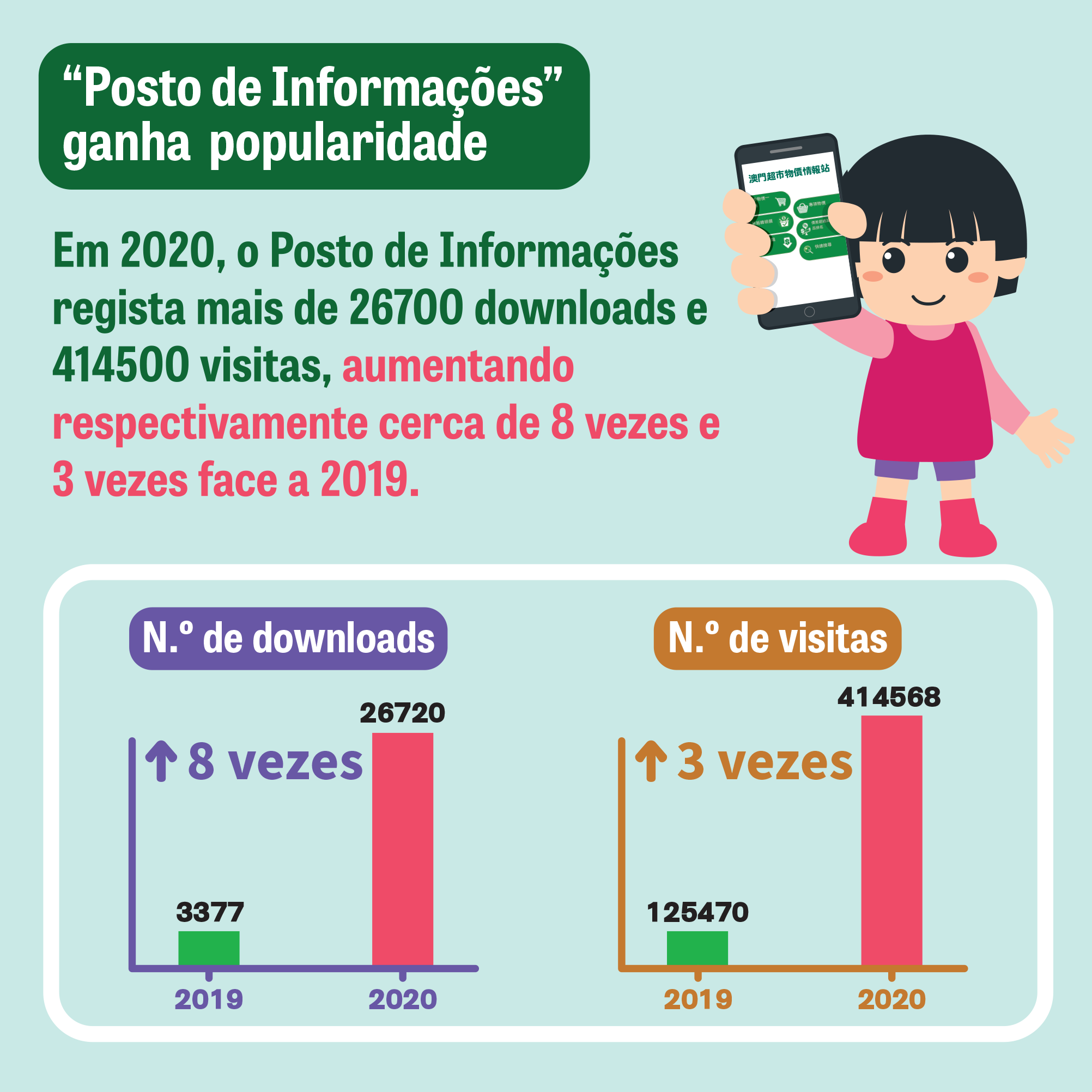 Em 2020, a aplicação informática “Posto de Informações de Preços de Macau” registou mais de 26700 downloads e mais de 414500 visitas, aumentando, respectivamente, cerca de 8 vezes e mais de 3 vezes face ao ano 2019.
