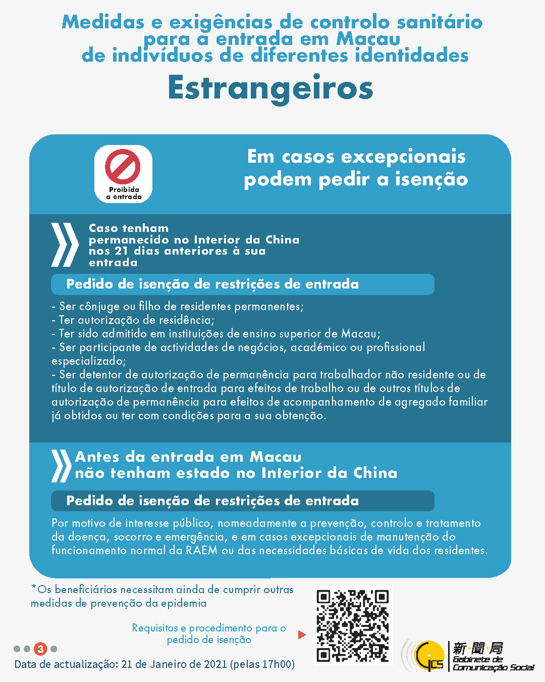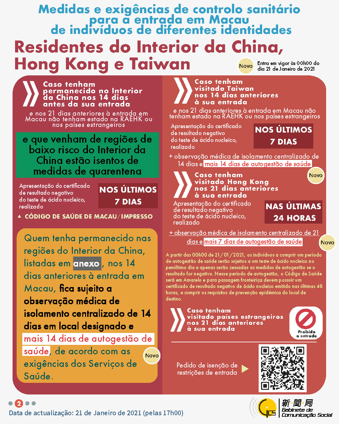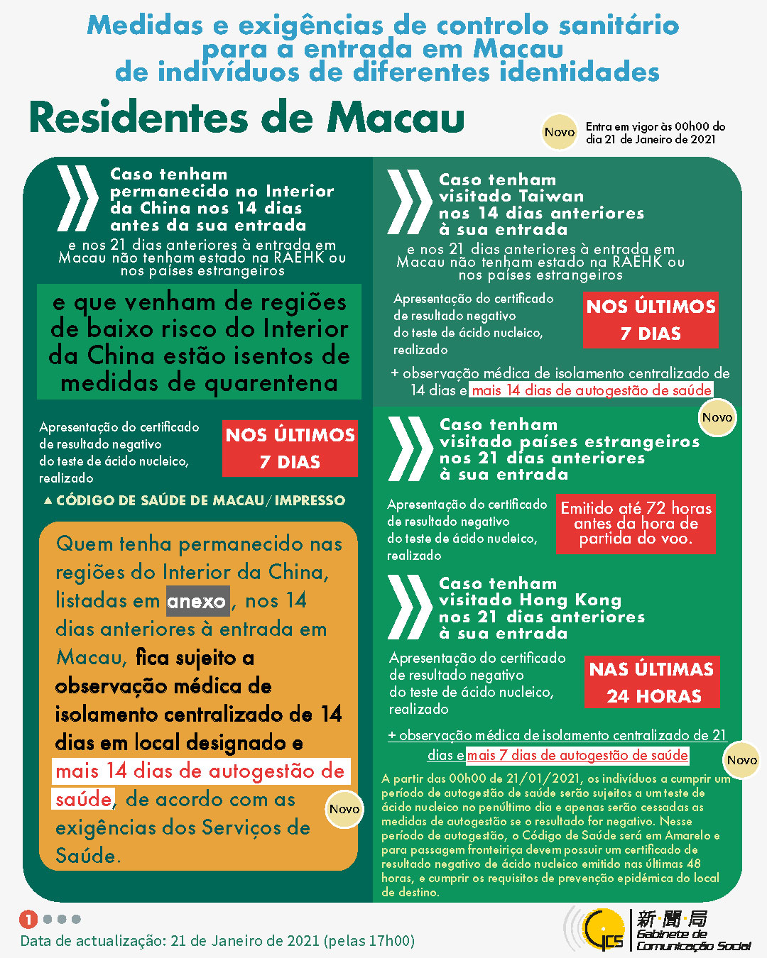 (Infografia) Medidas e exigências de controlo sanitário para a entrada em Macau de indivíduos de diferentes identidades, actualizadas no dia 21 de Janeiro de 2021