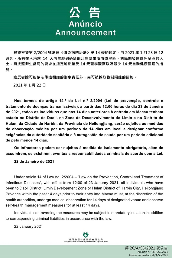 O Centro de Coordenação de Contingência do Novo Tipo de Coronavírus informa que tendo em consideração a evolução epidemiológica mais actualizada da Província de Heilongjiang, nos termos do artigo 14.º da Lei n.º 2/2004 (Lei de prevenção, controlo e tratamento de doenças transmissíveis), a partir das 00:00 horas do dia 23 de Janeiro de 2021, todos os indivíduos que nos 14 dias anteriores à entrada em Macau tenham estado no Distrito de Daoli, na Zona de Desenvolvimento de Limin e no Distrito de Hulan, da Cidade de Harbin, da Província de Heilongjiang, serão sujeitos à observação médica por um período de 14 dias em local a designar conforme exigências da autoridade sanitária e à autogestão de saúde por um período adicional de pelo menos 14 dias. Os infractores podem ser sujeitos à medida de isolamento obrigatório, além de assumirem eventuais responsabilidades criminais que ao caso couber.
