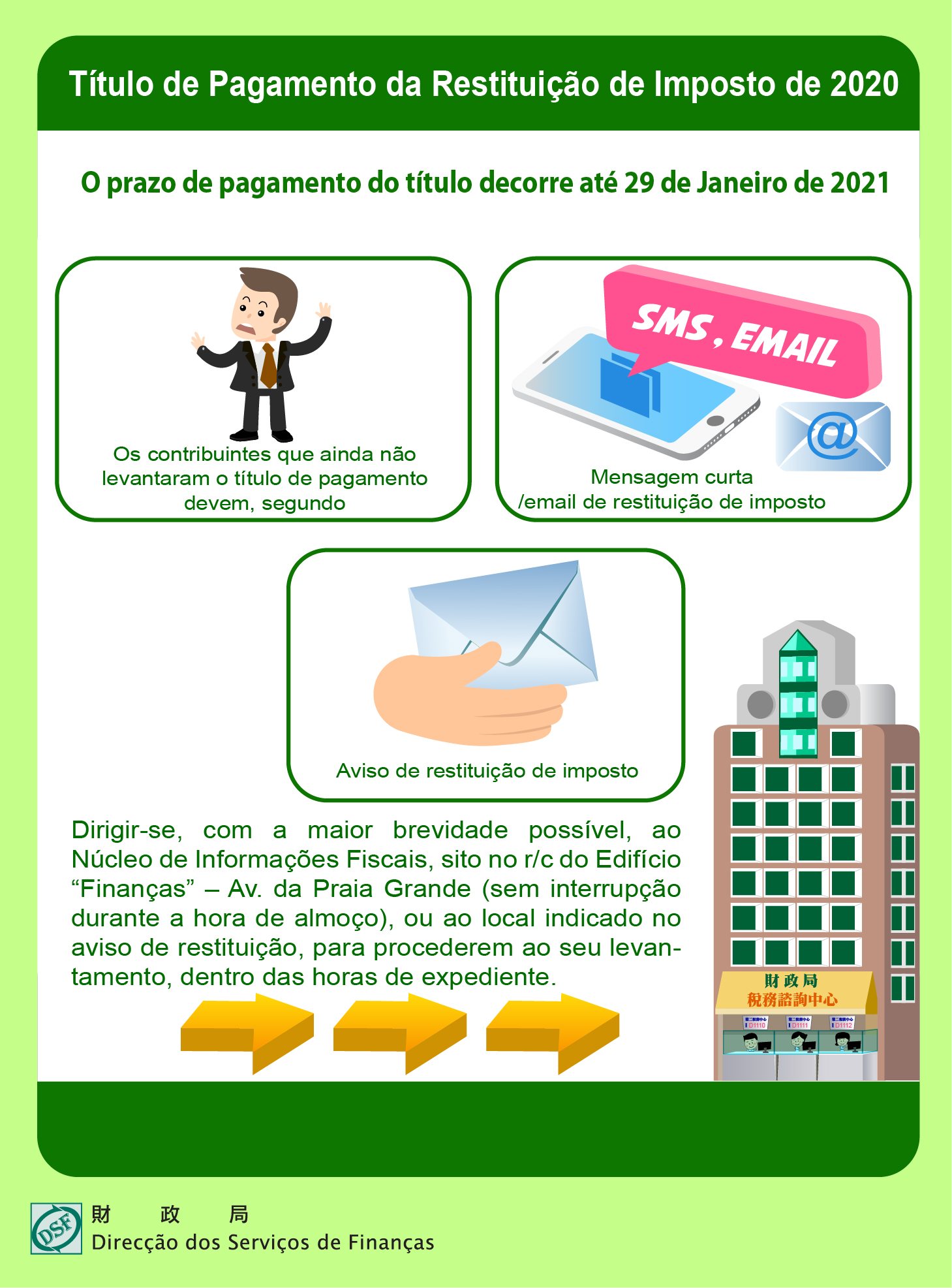 Tendo em conta que o prazo de pagamento dos títulos relativos à restituição de imposto, emitidos em 2020, decorre até ao dia 29 de Janeiro de 2021, a Direcção dos Serviços de Finanças apela a todos os contribuintes que ainda não levantaram o título de pagamento para dirigir-se, com a maior brevidade possível, de acordo com o aviso de restituição ou a mensagem curta/email de restituição de imposto, ao Núcleo de Informações Fiscais, sito no r/c do Edifício “Finanças” – Avenida da Praia Grande, ou ao local indicado no respectivo aviso de restituição, no sentido de procederem ao levantamento do mesmo, dentro das horas de expediente (sem interrupção durante a hora de almoço).