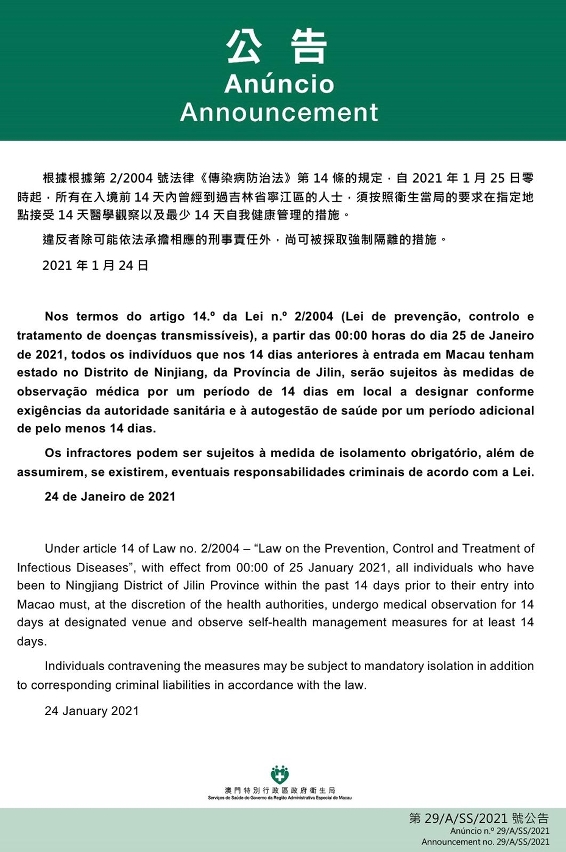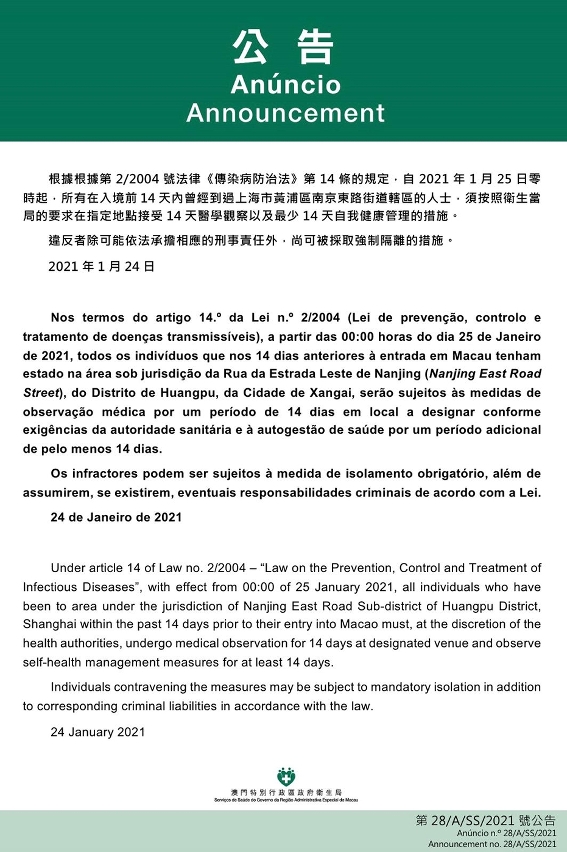 O Centro de Coordenação de Contingência do Novo Tipo de Coronavírus informa que tendo em consideração a evolução epidemiológica mais actualizada da Cidade de Xangai, nos termos do artigo 14.º da Lei n.º 2/2004 (Lei de prevenção, controlo e tratamento de doenças transmissíveis), a partir das 00:00 horas do dia 25 de Janeiro de 2021, todos os indivíduos que nos 14 dias anteriores à entrada em Macau tenham estado na área sob jurisdição da Rua da Estrada Leste de Nanjing (Nanjing East Road Street), do Distrito de Huangpu, da Cidade de Xangai, ou no Distrito de Ninjiang, da Cidade de Songyuan, da Província de Jilin, serão sujeitos à observação médica por um período de 14 dias em local a designar conforme exigências da autoridade sanitária e à autogestão de saúde por um período adicional de pelo menos 14 dias. Os infractores podem ser sujeitos à medida de isolamento obrigatório, além de assumirem eventuais responsabilidades criminais que ao caso couber.