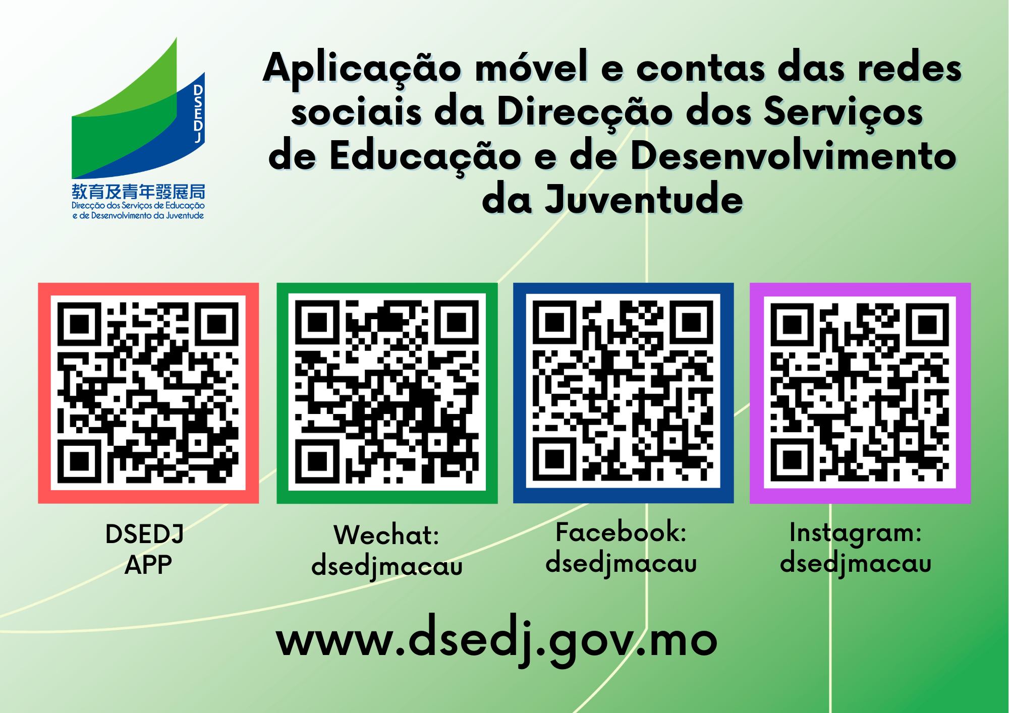 Relativamente às redes sociais, as contas de WeChat, Facebook e Instagram, da Direcção dos Serviços de Educação e de Desenvolvimento da Juventude, foram actualizadas, podendo os cidadãos pesquisar “Direcção dos Serviços de Educação e de Desenvolvimento da Juventude” ou “dsedjmacau”, no WeChat; no Facebook e no Instagram, podem pesquisar “Comunidade educativa por excelência” ou “dsedjmacau”, para consultar as últimas informações da DSEDJ.