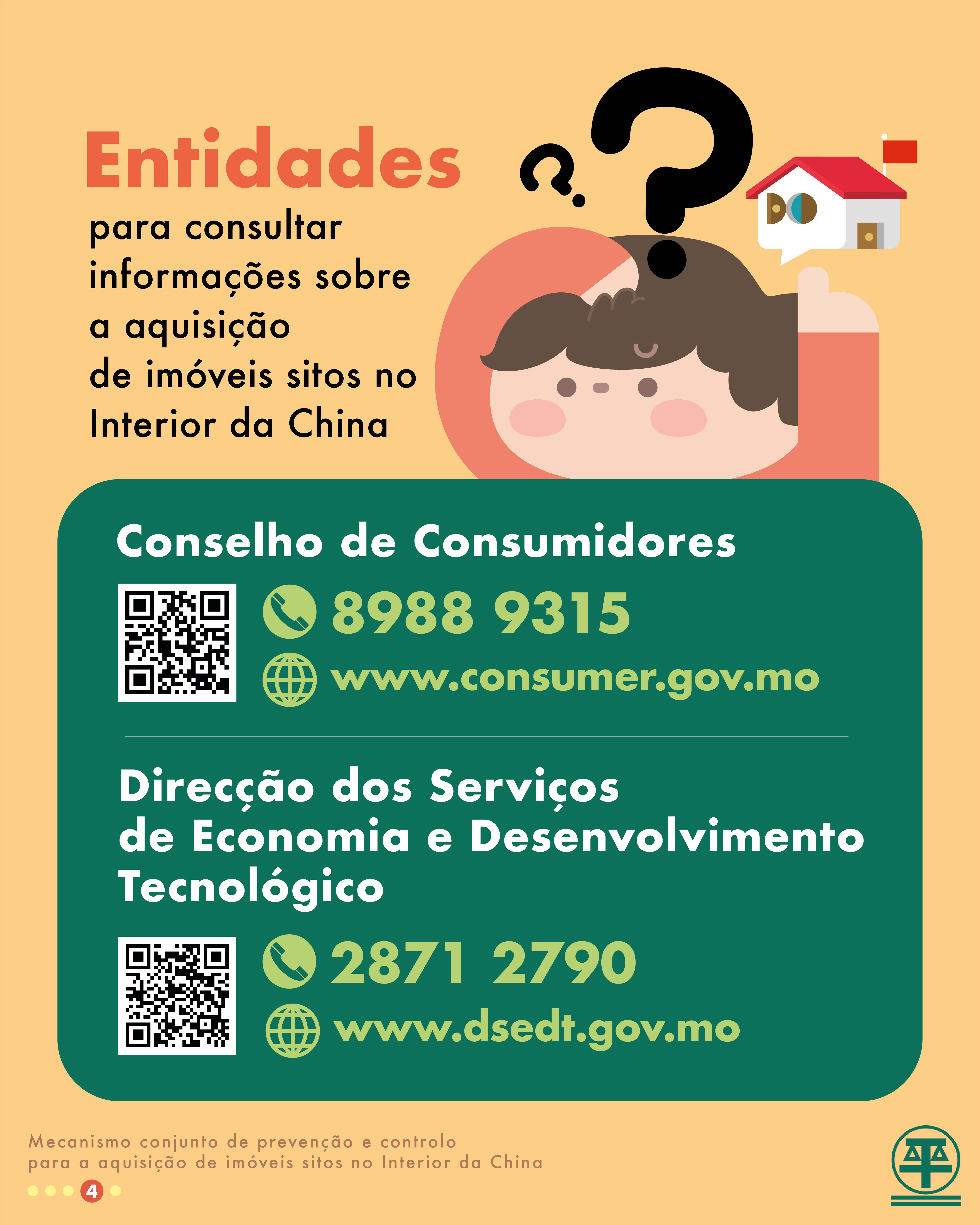 A Direcção dos Serviços de Economia e Desenvolvimento Tecnológico (DSEDT) e o Conselho de Consumidores (CC) criaram o “mecanismo conjunto de prevenção e controlo para a aquisição de imóveis sitos no Interior da China pelos residentes de Macau” com Zhuhai, Zhongshan e Jiangmen, que, através da sensibilização jurídica, da troca de informações e da cooperação na fiscalização, visa supervisar o cumprimento do disposto no que respeita à publicação dos anúncios de imóveis situados no Interior da China, bem como foi lançada uma zona específica para a verificação das informações sobre a venda de imóveis sitos no Interior da China, de maneira a trazer maior protecção aos consumidores tornando-os mais cientes dos riscos na aquisição de habitação.
