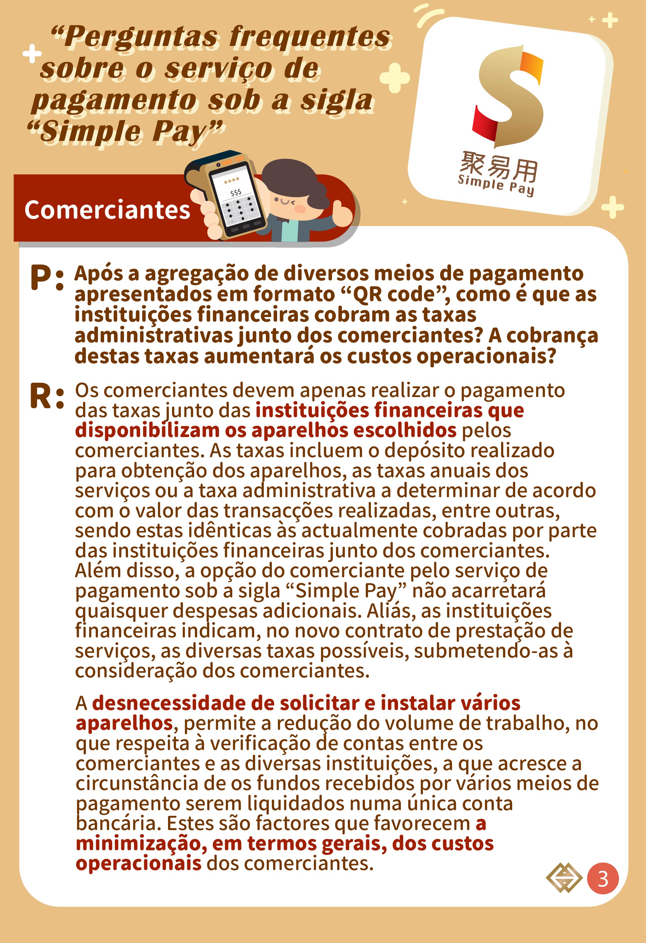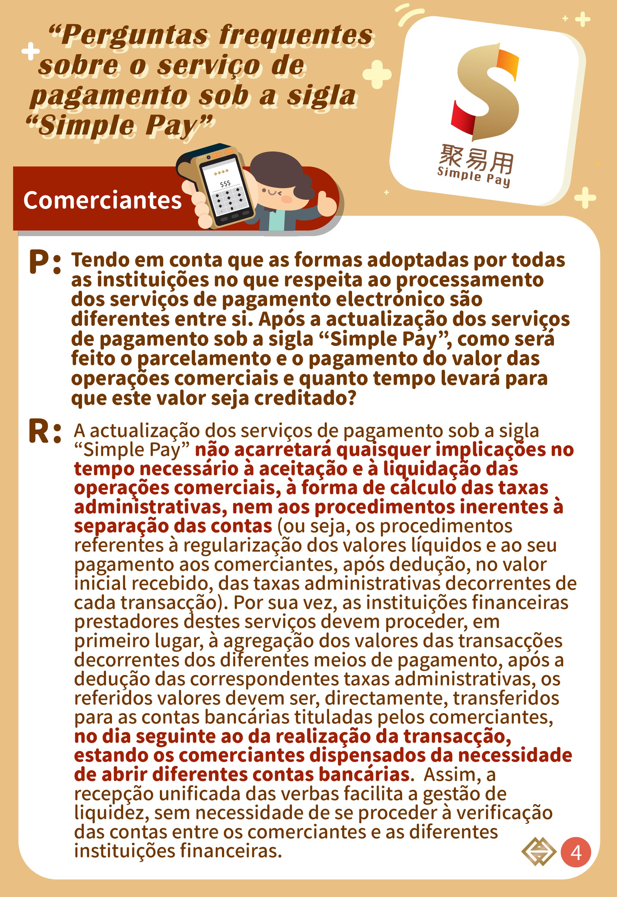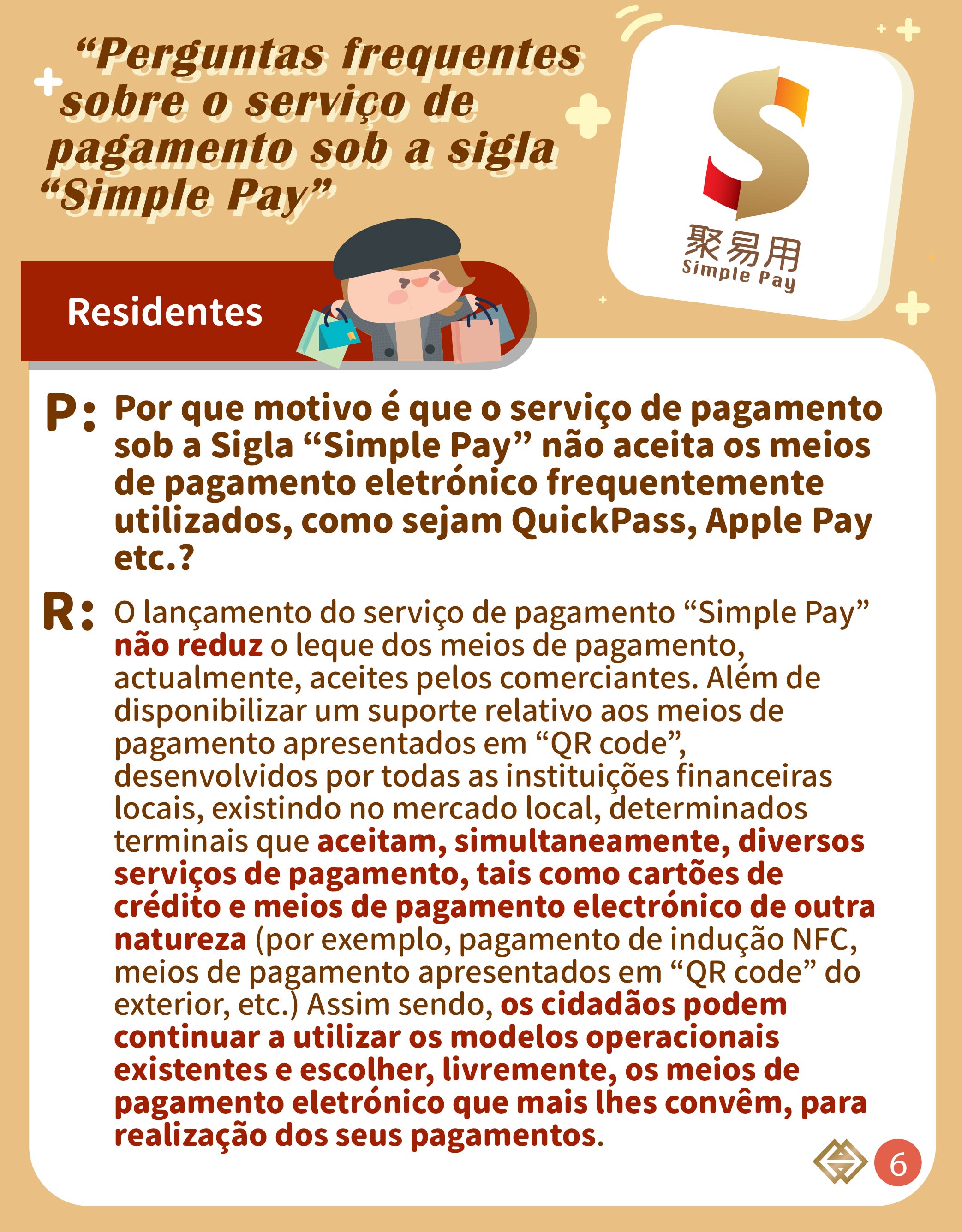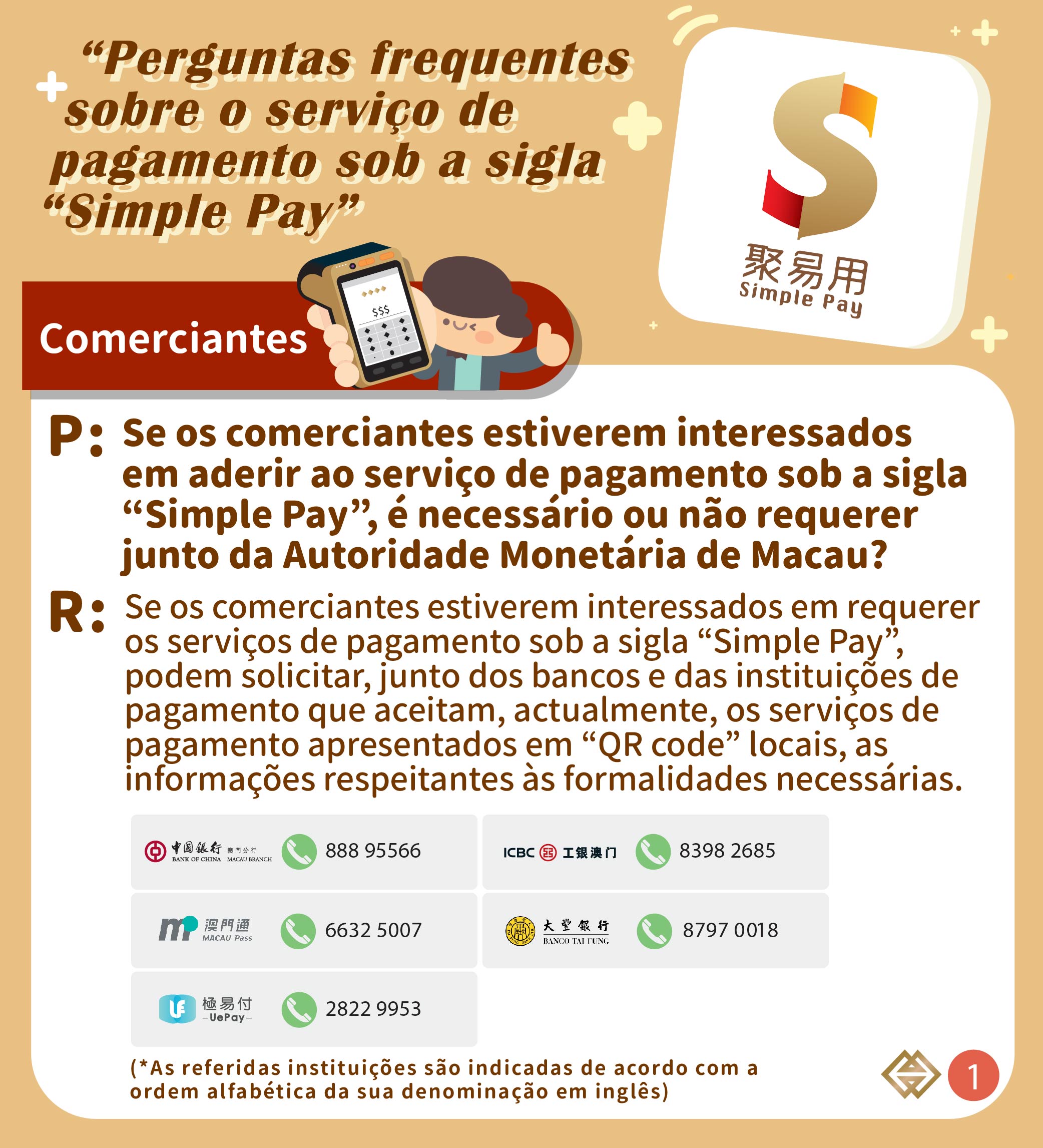 Para mais esclarecimentos, queiram por favor contactar directamente os respectivos bancos e instituições de pagamento, ou contactar a AMCM através do telefone n.º 2856 8856, podendo ser consultadas as informações detalhadas na página electrónica temática do “Simple Pay” (https://www.amcm.gov.mo/pt/news-and-announcements/simplepay).