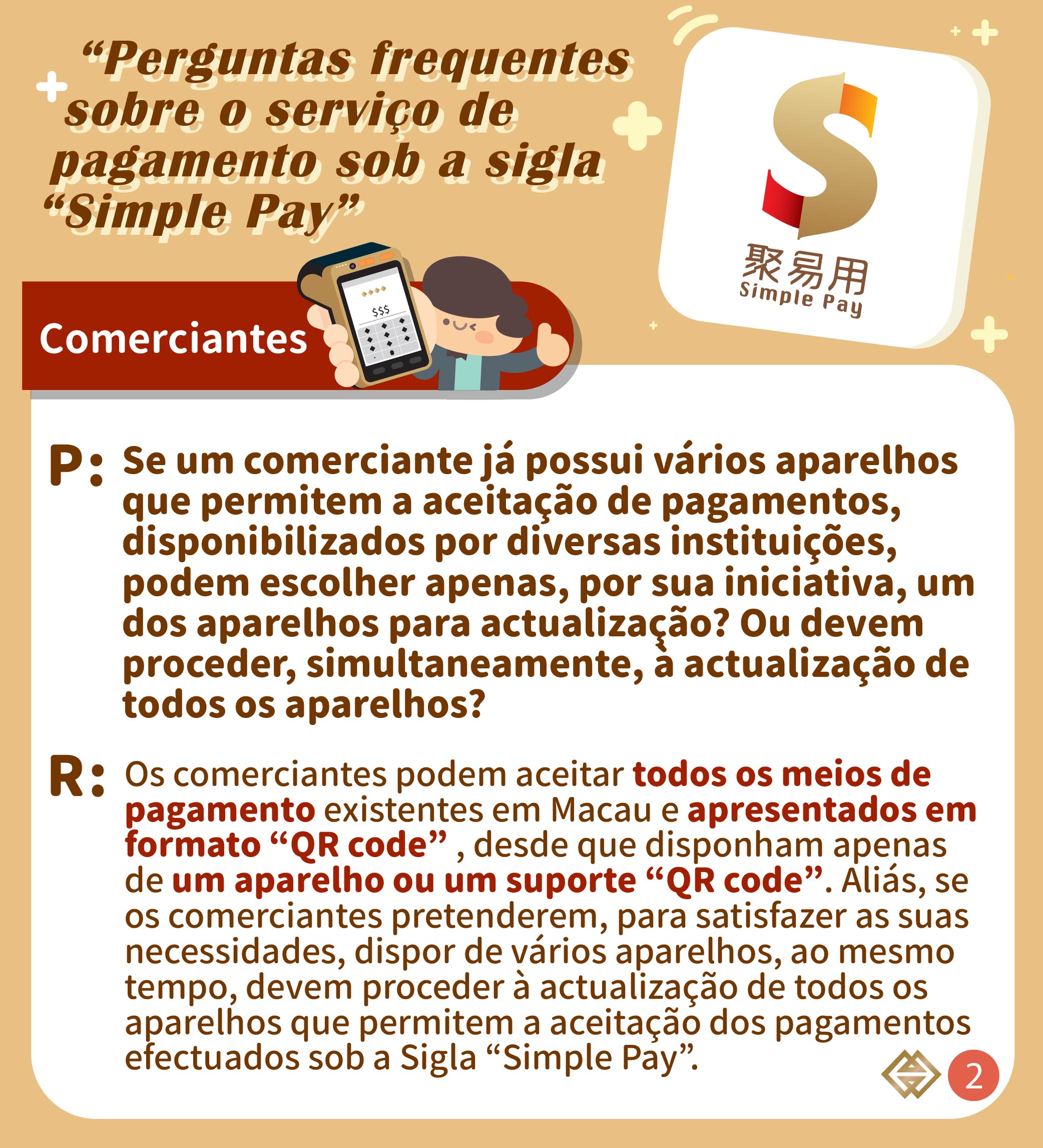 O serviço do “pagamento agregado” sob a sigla “Simple Pay” é o resultado da cooperação entre os bancos e instituições de pagamento locais, promovida pela AMCM, consistindo na abertura de plataformas de pagamento das respectivas instituições no sentido de estabelecer uma interligação e interconexão, permitindo que os comerciantes possam aceitar todos os instrumentos de pagamento apresetandos em “QR code” existentes em Macau, através de um terminal ou suporte em “QR code”. O pagamento agregado é uma das medidas relevantes do Governo da RAEM sobre a promoção da facilidade e da conveniência aos cidadãos e às empresas, simbolizando um novo avanço e uma nova fase do desenvolvimento dos pagamentos electrónicos em Macau, desempenhando o papel de fomento do desenvolvimento da economia digital na RAEM.