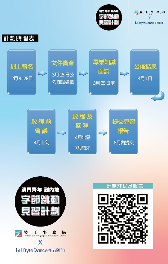 Os destinatários do estágio devem ser jovens residentes de Macau que completaram o curso de ensino superior no ano de 2019 ou 2020. Os jovens interessados podem, entre 9 e 28 de Fevereiro de 2021, aceder à página electrónica da DSAL para proceder a inscrição online. Posteriormente, a DSAL vai analisar os documentos e dados de candidatura para proceder à selecção dos candidatos que satisfaçam os requisitos do posto de trabalho para a admissão à fase de entrevista, e a “ByteDance” que encarregue nos trabalhos de entrevista, vai seleccionar os candidatos admitidos elegíveis, prevendo que os trabalhos de selecção irão ser concluídos dentro do Março e os resultados relevantes irão ser anunciados no início de Abril. O candidato admitido ao estágio pode receber um subsídio de subsistência atribuído pelas coorganizadoras e um subsídio de transporte atribuído pela DSAL, e para mais informações, consulte o regulamento online ( https://www.dsal.gov.mo/zh_tw/standard/employment_recruitment_intern_plan1.html ).