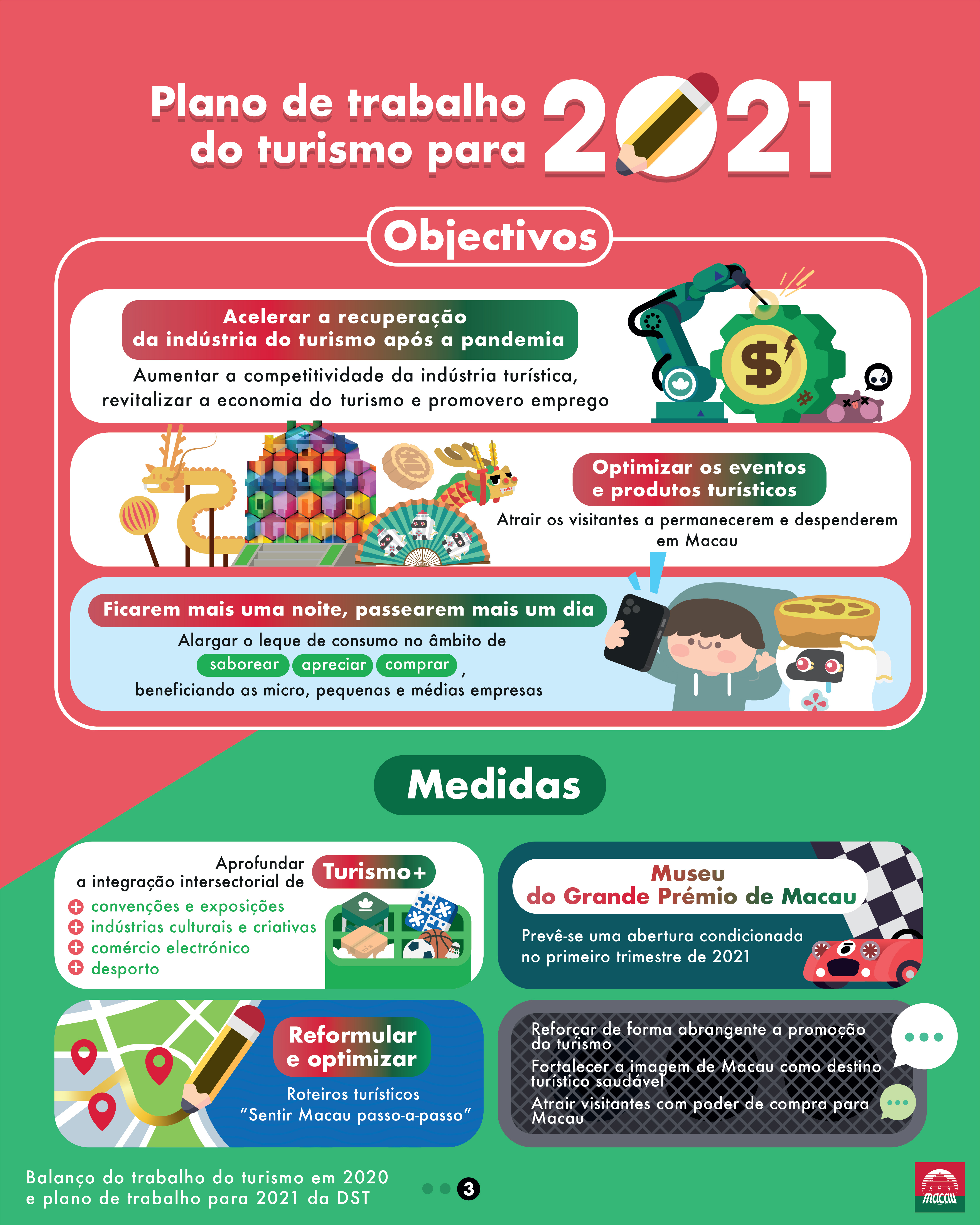 De forma a acelerar a recuperação da indústria do turismo após a pandemia, a DST reforçará a promoção da imagem de Macau como cidade saudável e segura para viajar, divulgar informações aos clientes-alvo através de marketing de precisão, promover produtos turísticos característicos, qualidade de serviços e actividades de descontos, impulsionando a diversificação dos mercados de origem. Para o mercado do Interior da China, a DST reforçará a cooperação com plataformas do comércio electrónico, explorará grupos de clientes-alvo e atrairá turistas potenciais para visitar Macau, de forma a alargar as fontes de visitantes. Para os visitantes chegados a Macau, serão divulgadas informações de descontos oferecidos por comerciantes locais, estimulando os visitantes a ficarem mais uma noite e passearem mais um dia, atraindo-os a permanecerem e despenderem em Macau, com o objectivo de revitalizar a economia. No que respeita ao mercado internacional, a DST irá organizar ou participar em seminários e promoções online, e continuar a utilizar as plataformas online para a divulgação de informações turísticas de Macau. Quando o mercado turístico global recuperar, a DST fortalecerá a utilização do marketing de precisão para promover produtos turísticos junto de grupos-alvo, a fim de atrair turistas internacionais para viajar e despender em Macau, de modo a revitalizar a economia local.